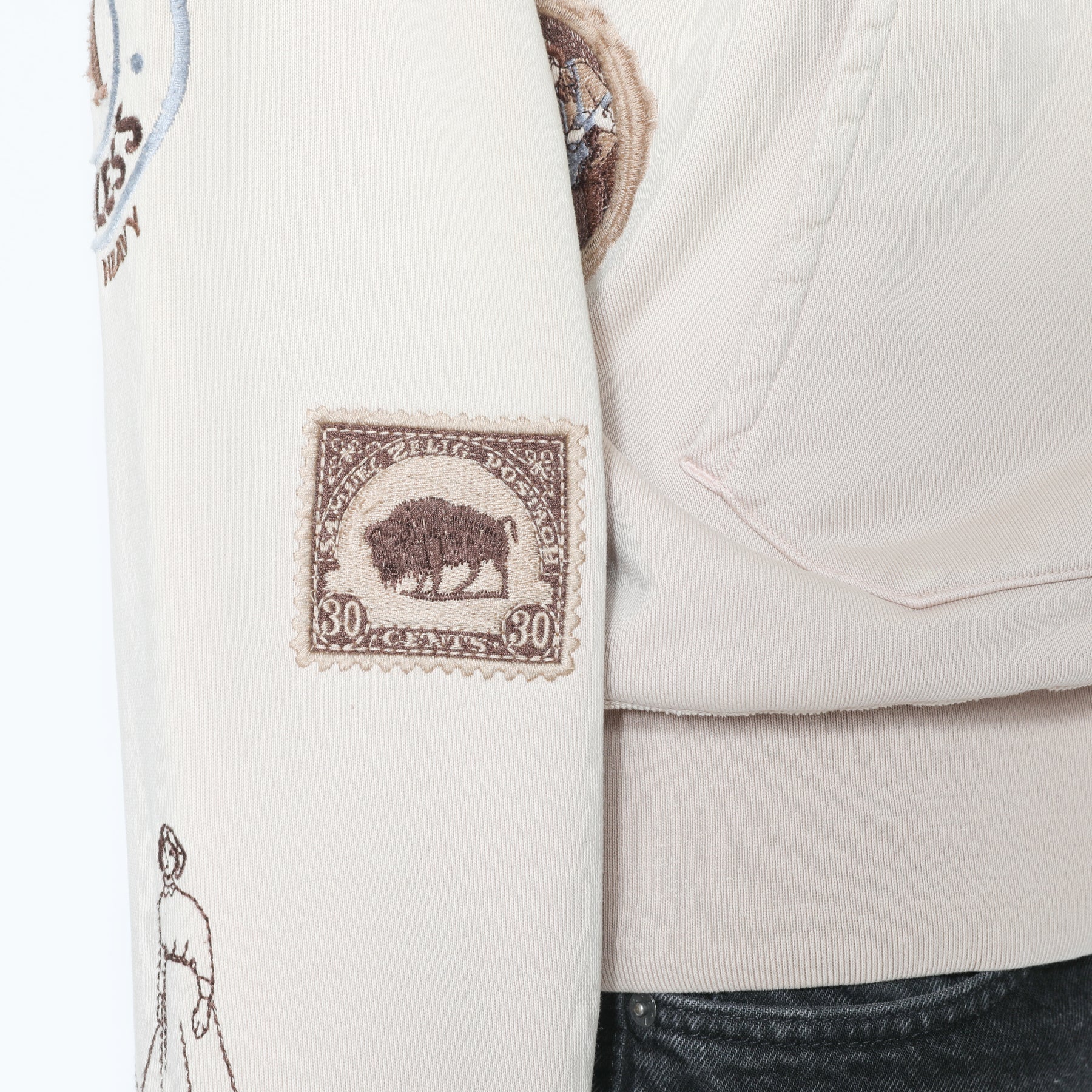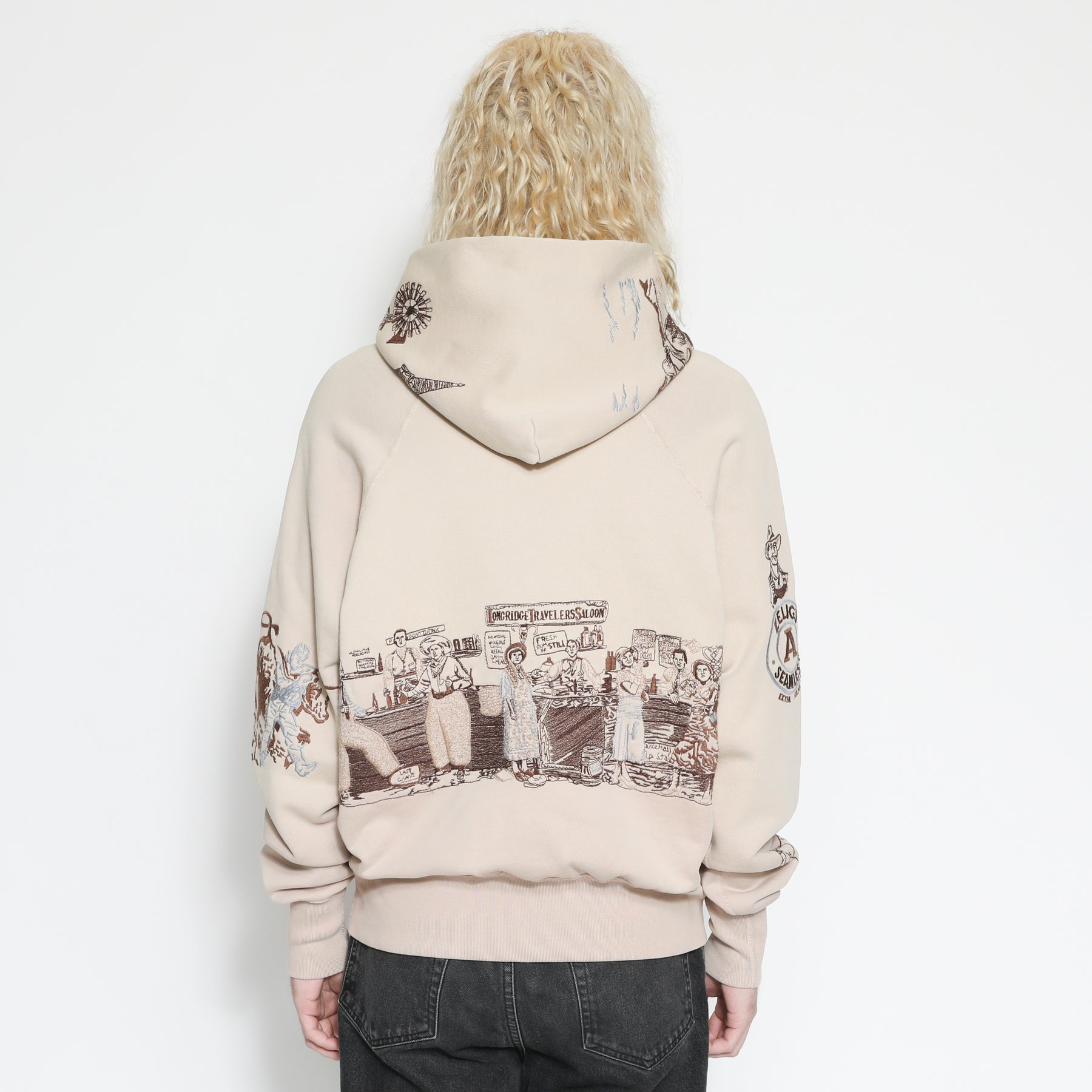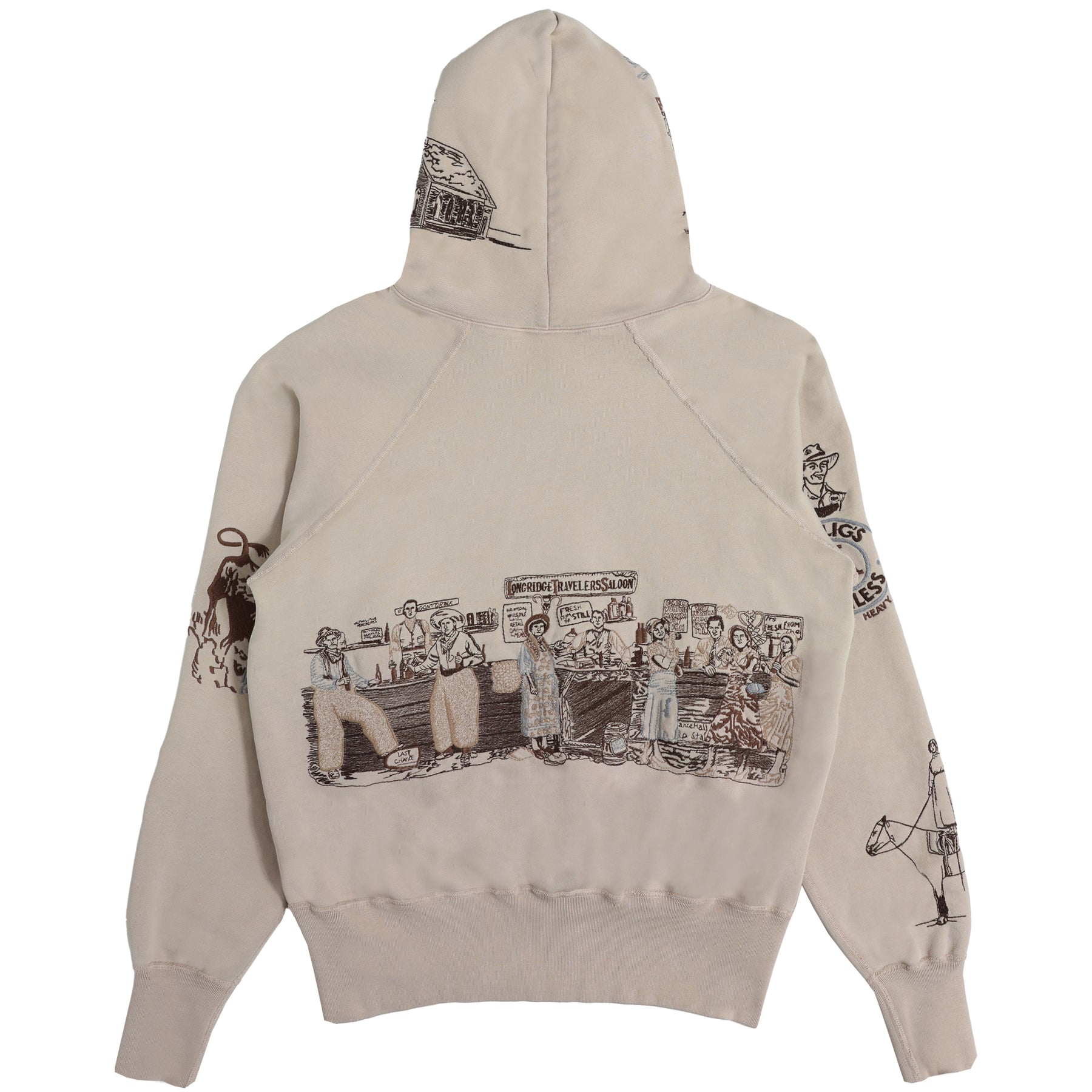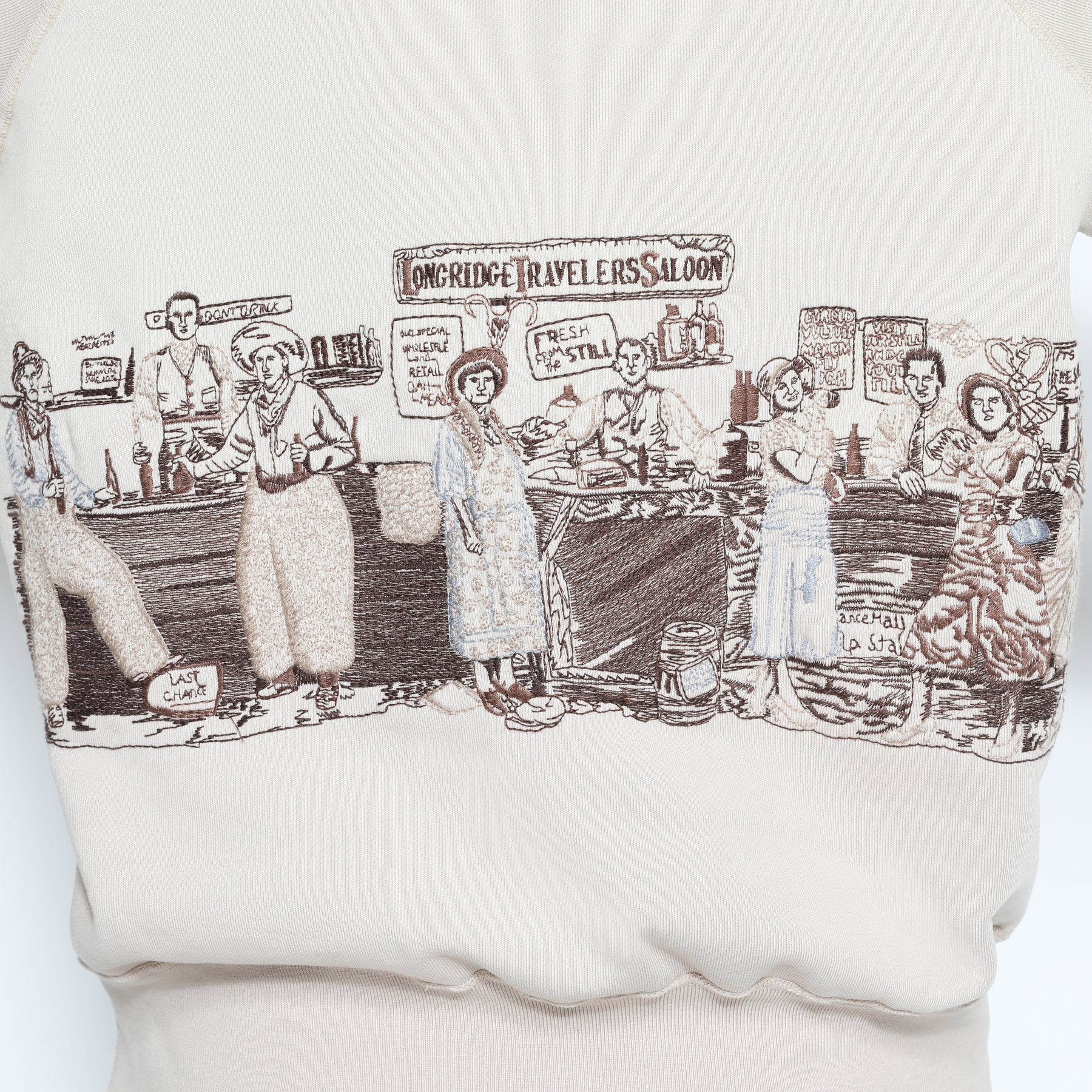When it comes to western imagery there are so many common subjects that come to mind: cowboys, horses, horseshoes, lassos, etc. Instead of this, we wanted to design a series of pieces that followed themes of travel that happened to be in the west. The final designs feature elements of postcards, unassuming emblems and objects found during travel, and characters and sights someone would see along the way. One focal point of these pieces is a large horizontal scene depicting an outdoor traveler's saloon. This embroidery was developed based on numerous vintage photographs of saloons throughout the west. The herringbone pants and zip jacket from this design group feature a vintage wash with elements of paint stains and discoloration commonly found on vintage coveralls, as well as grey stitching to contrast the natural base color fabric.