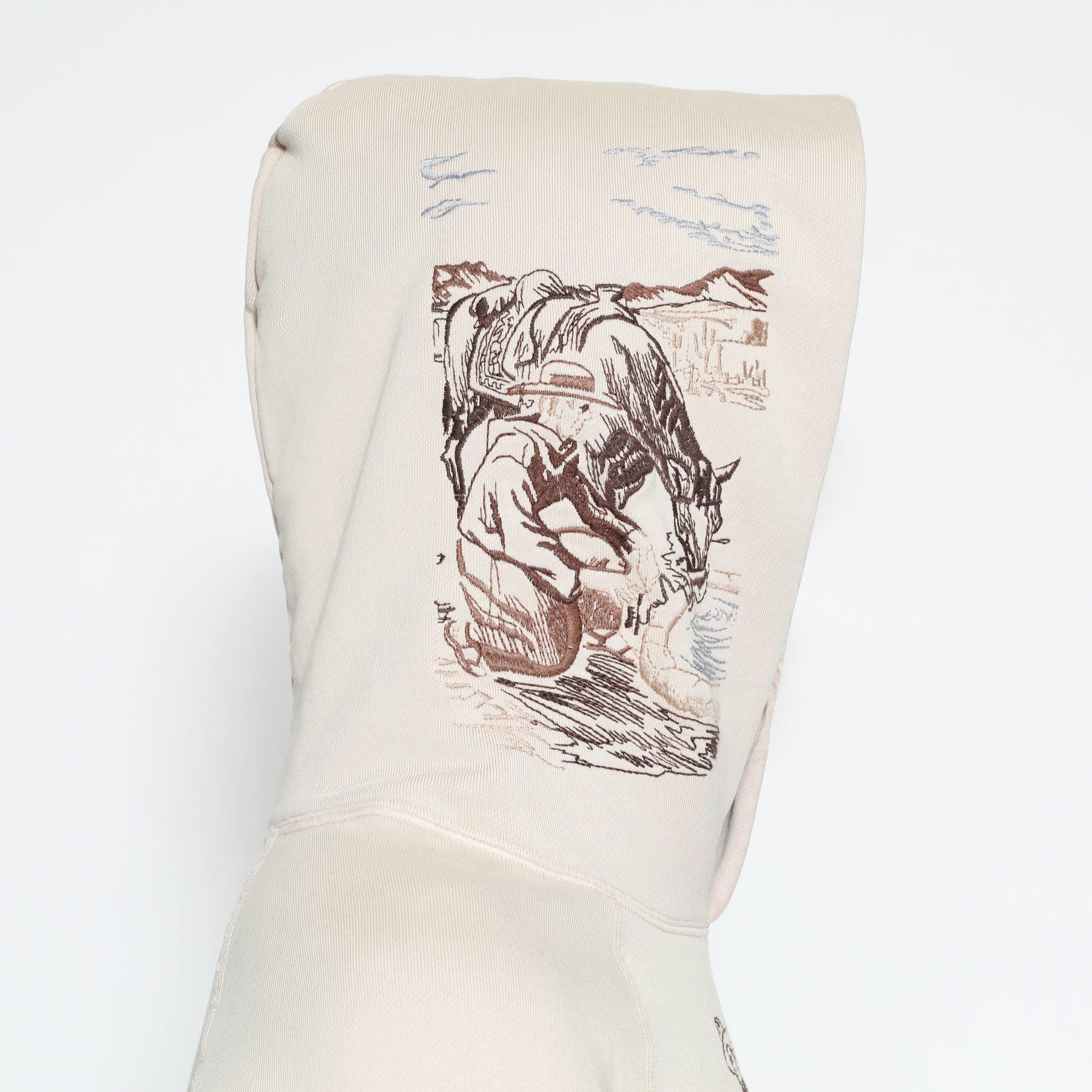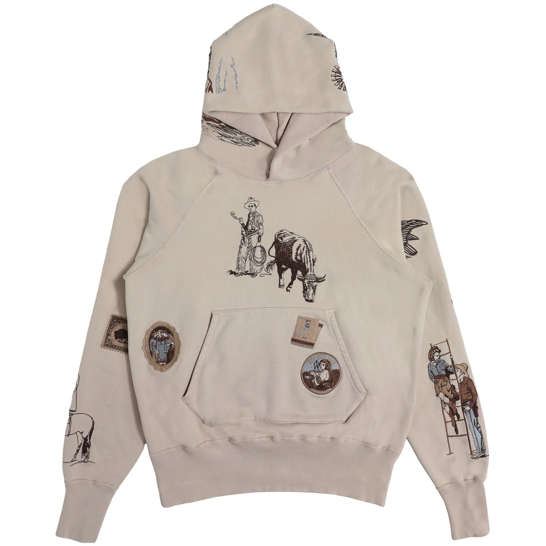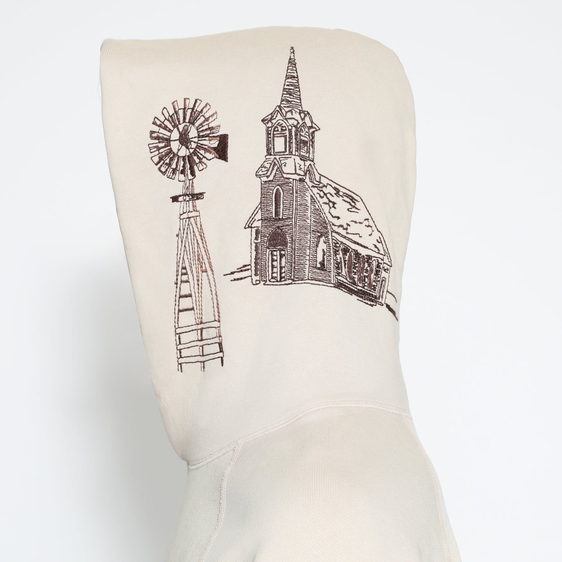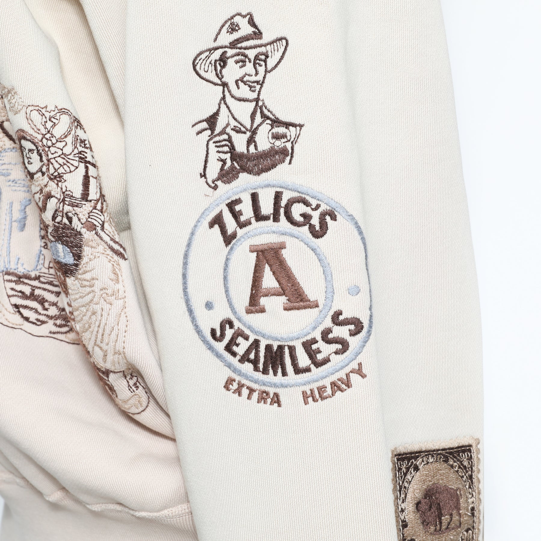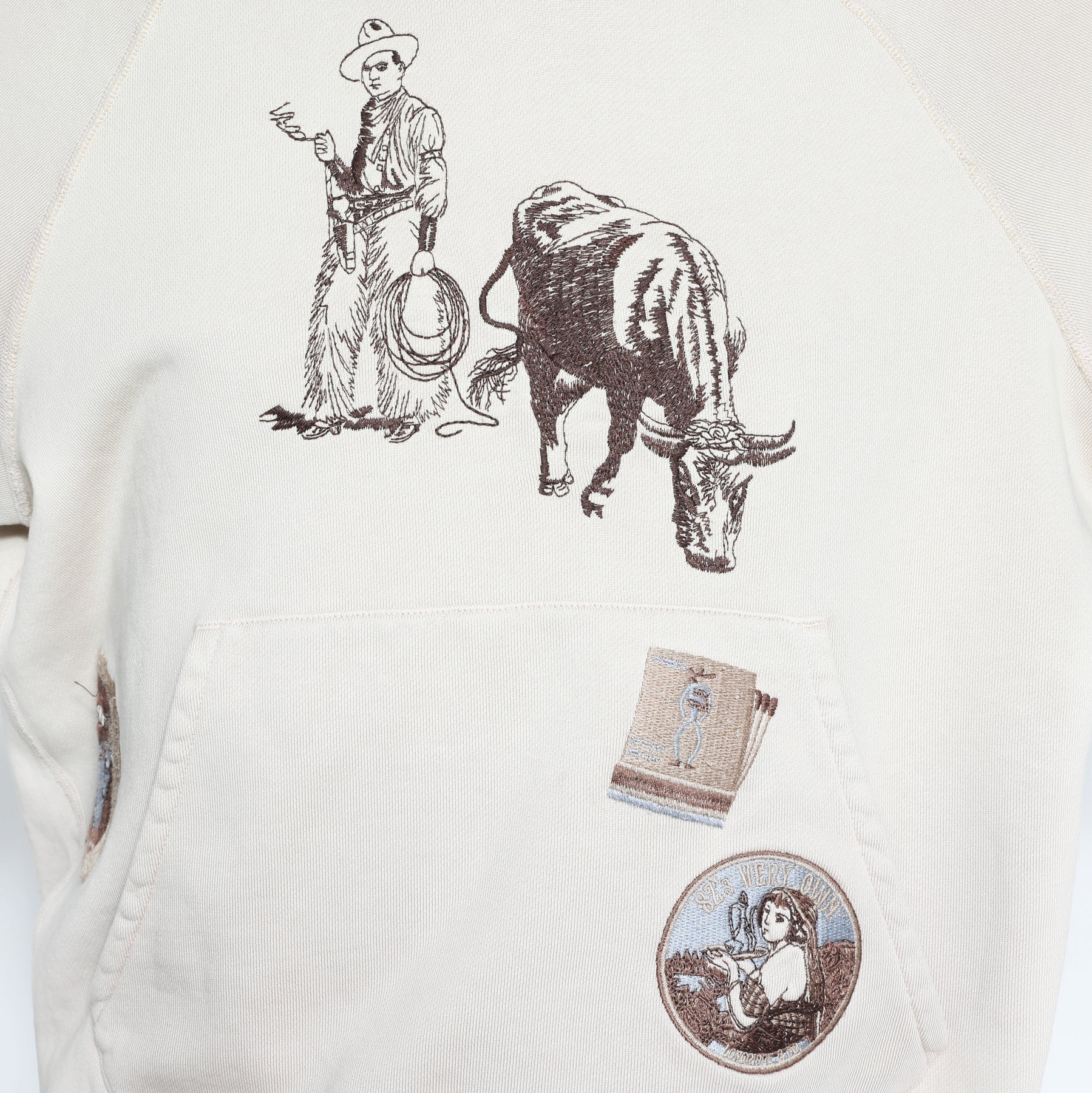 When it comes to western imagery there are so many common subjects that come to mind: cowboys, horses, horseshoes, lassos, etc. Instead of this, we wanted to design a series of pieces that followed themes of travel that happened to be in the west. The final designs feature elements of postcards, unassuming emblems and objects found during travel, and characters and sights someone would see along the way. One focal point of these pieces is a large horizontal scene depicting an outdoor traveler's saloon. This embroidery was developed based on numerous vintage photographs of saloons throughout the west. The herringbone pants and zip jacket from this design group feature a vintage wash with elements of paint stains and discoloration commonly found on vintage coveralls, as well as grey stitching to contrast the natural base color fabric.