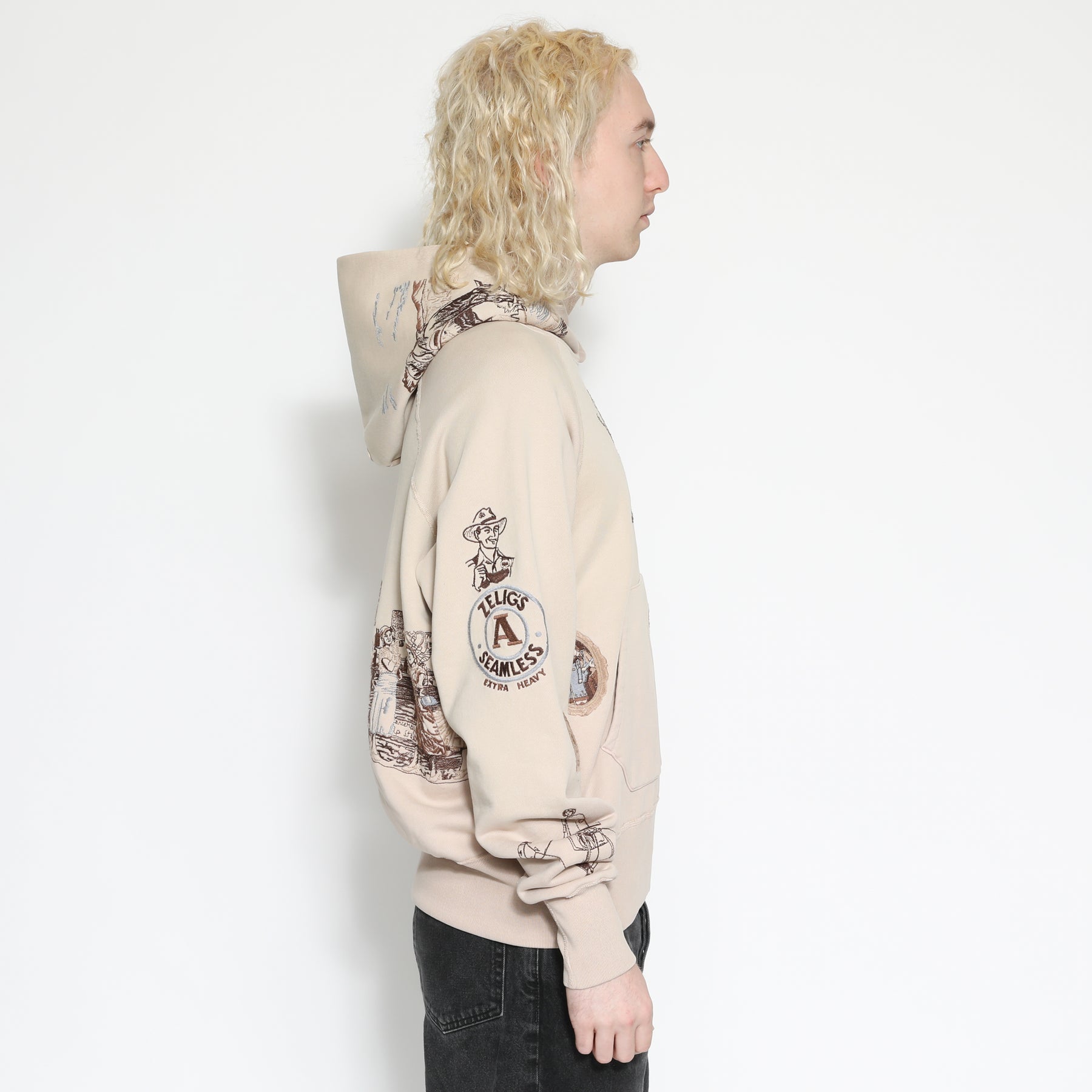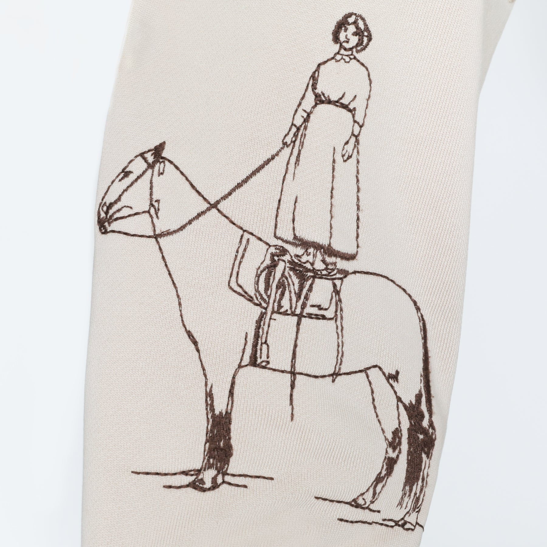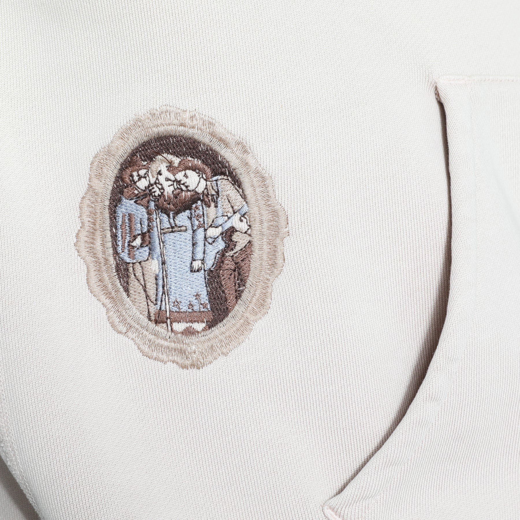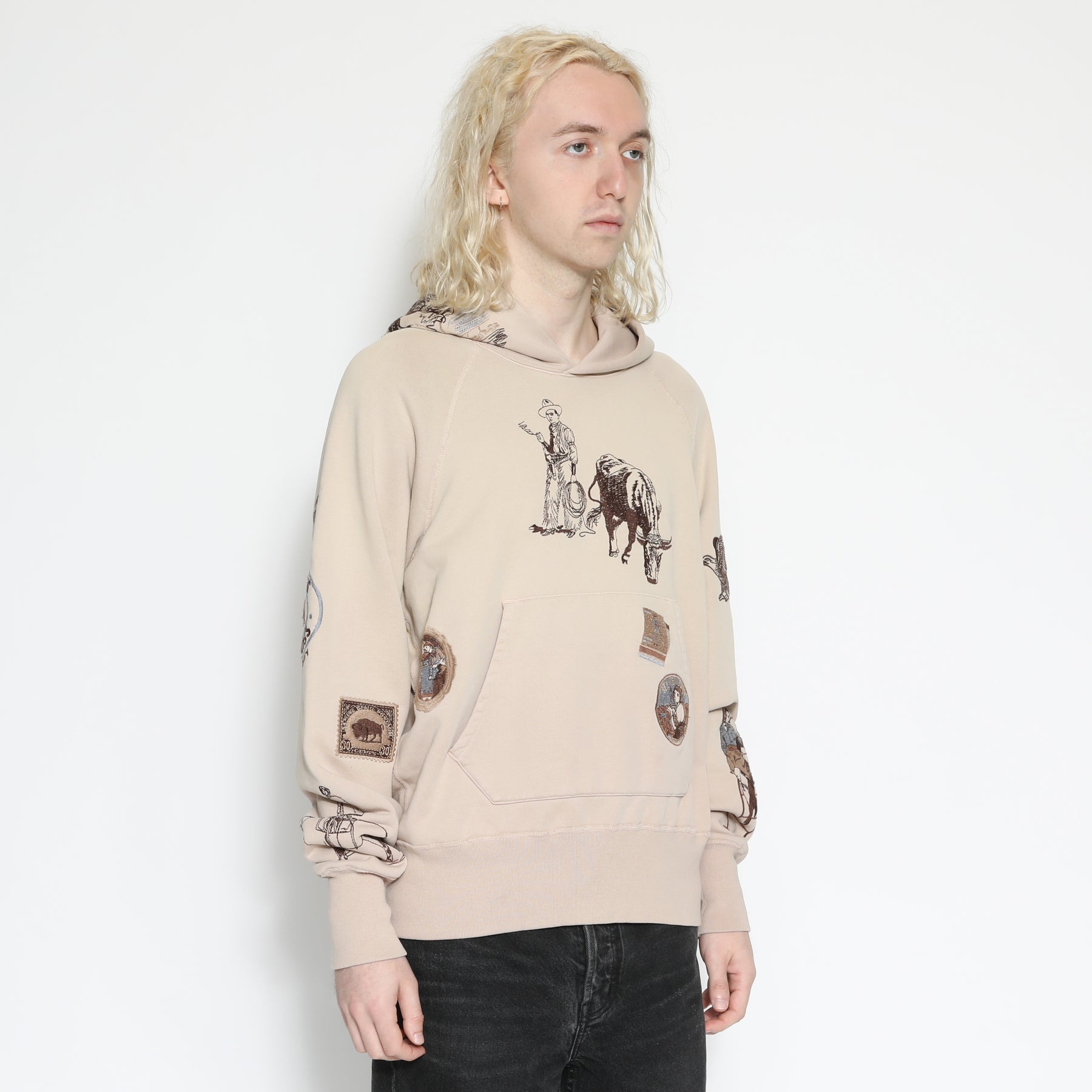 When it comes to western imagery there are so many common subjects that come to mind: cowboys, horses, horseshoes, lassos, etc. Instead of this, we wanted to design a series of pieces that followed themes of travel that happened to be in the west. The final designs feature elements of postcards, unassuming emblems and objects found during travel, and characters and sights someone would see along the way. One focal point of these pieces is a large horizontal scene depicting an outdoor traveler's saloon. This embroidery was developed based on numerous vintage photographs of saloons throughout the west. The herringbone pants and zip jacket from this design group feature a vintage wash with elements of paint stains and discoloration commonly found on vintage coveralls, as well as grey stitching to contrast the natural base color fabric.