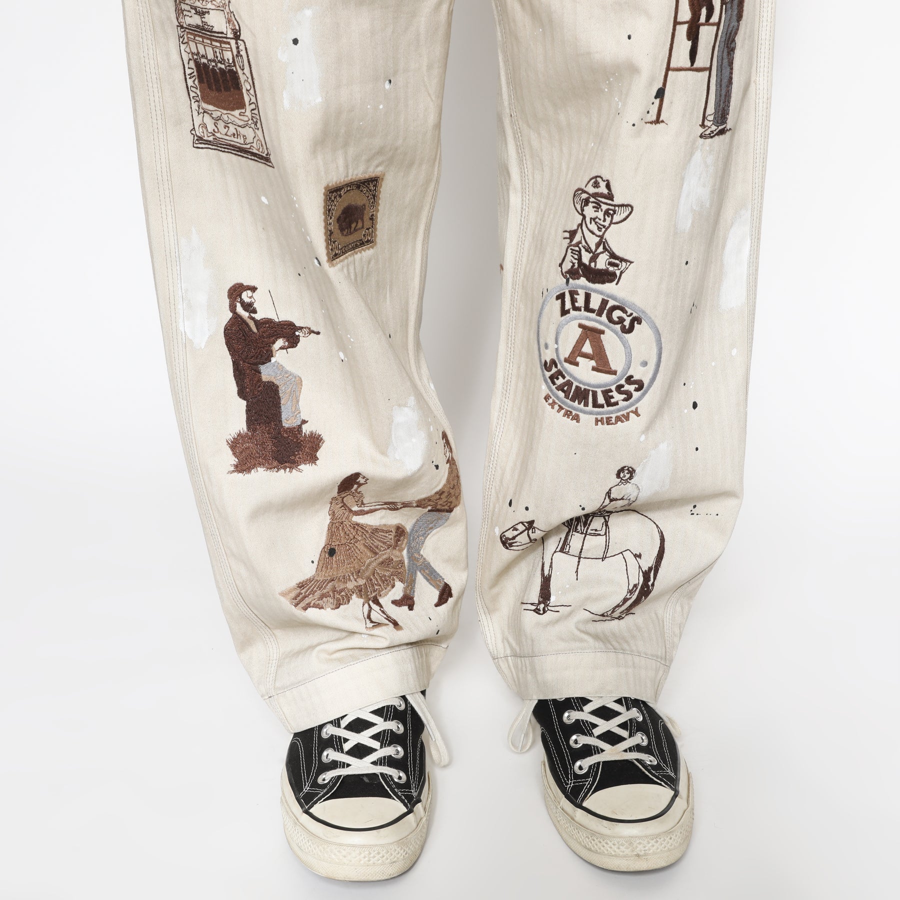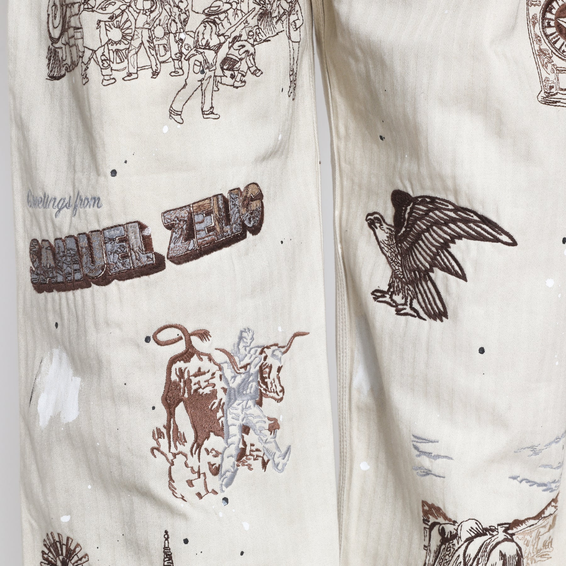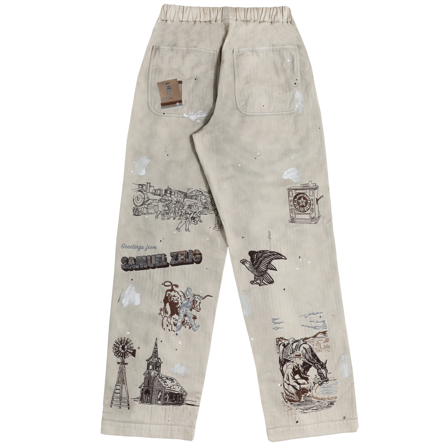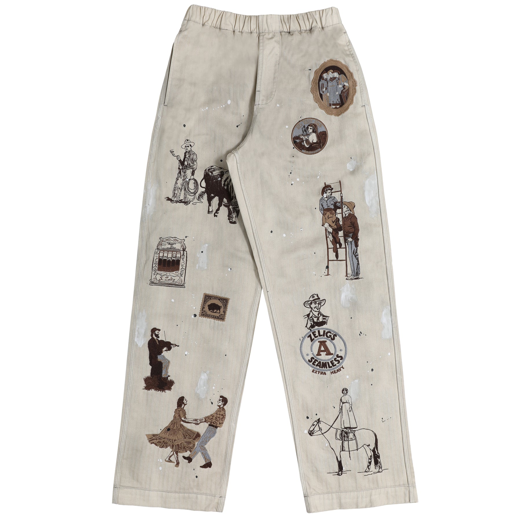 When it comes to western imagery there are so many common subjects that come to mind: cowboys, horses, horseshoes, lassos, etc. Instead of this, we wanted to design a series of pieces that followed themes of travel that happened to be in the west. The final designs feature elements of postcards, unassuming emblems and objects found during travel, and characters and sights someone would see along the way. One focal point of these pieces is a large horizontal scene depicting an outdoor traveler's saloon. This embroidery was developed based on numerous vintage photographs of saloons throughout the west. The herringbone pants and zip jacket from this design group feature a vintage wash with elements of paint stains and discoloration commonly found on vintage coveralls, as well as grey stitching to contrast the natural base color fabric.