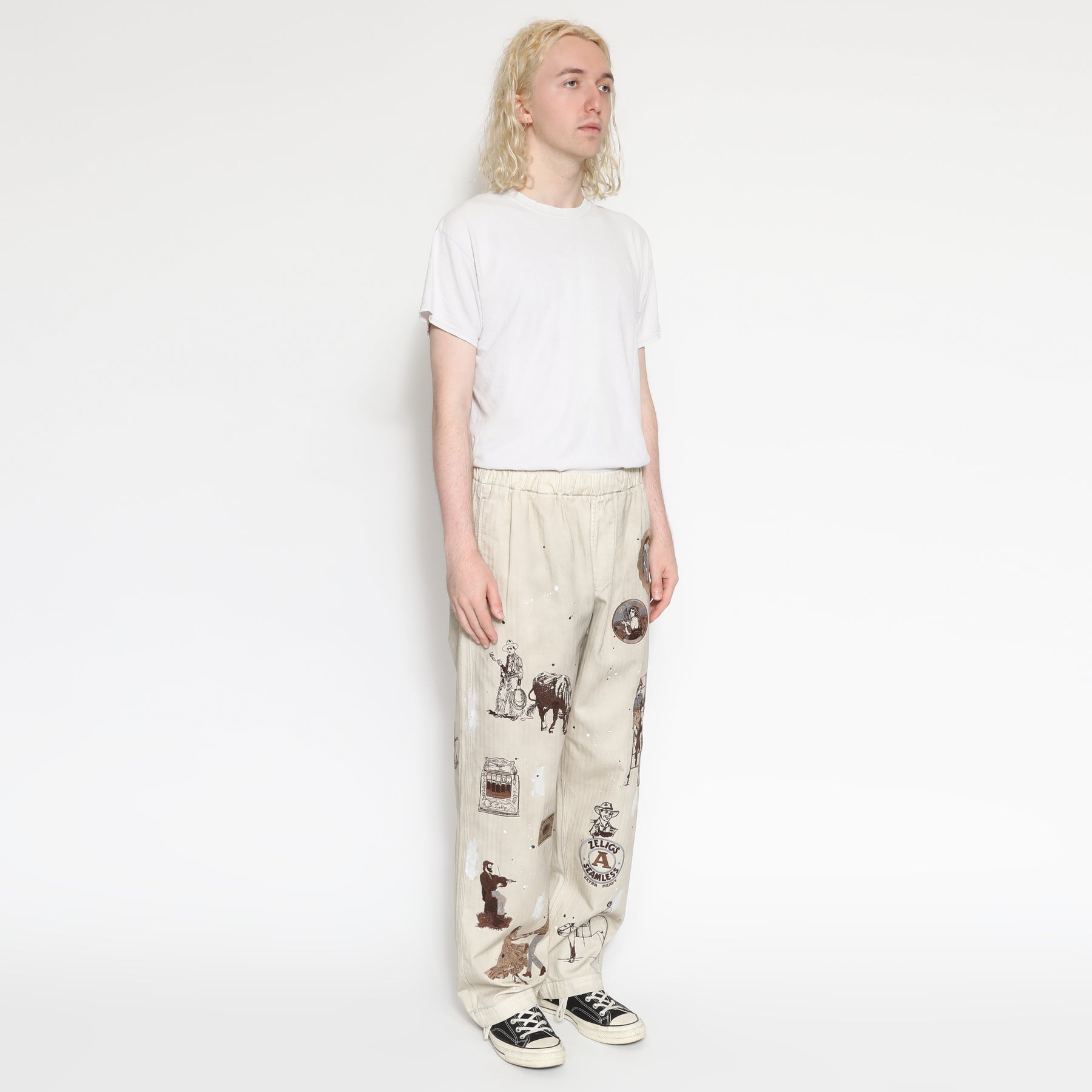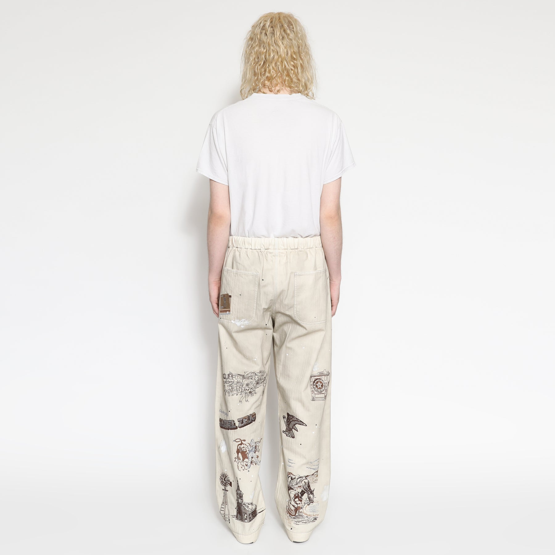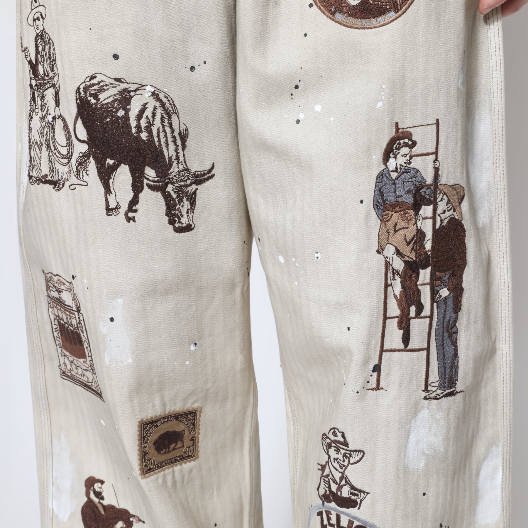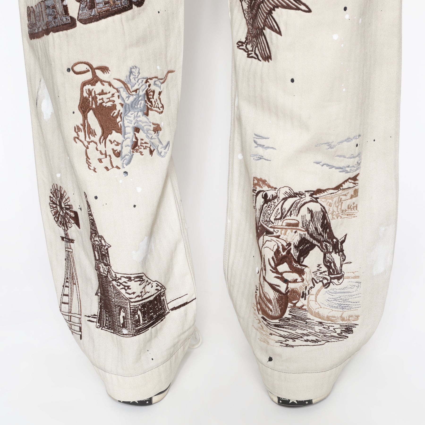 When it comes to western imagery there are so many common subjects that come to mind: cowboys, horses, horseshoes, lassos, etc. Instead of this, we wanted to design a series of pieces that followed themes of travel that happened to be in the west. The final designs feature elements of postcards, unassuming emblems and objects found during travel, and characters and sights someone would see along the way. One focal point of these pieces is a large horizontal scene depicting an outdoor traveler's saloon. This embroidery was developed based on numerous vintage photographs of saloons throughout the west. The herringbone pants and zip jacket from this design group feature a vintage wash with elements of paint stains and discoloration commonly found on vintage coveralls, as well as grey stitching to contrast the natural base color fabric.