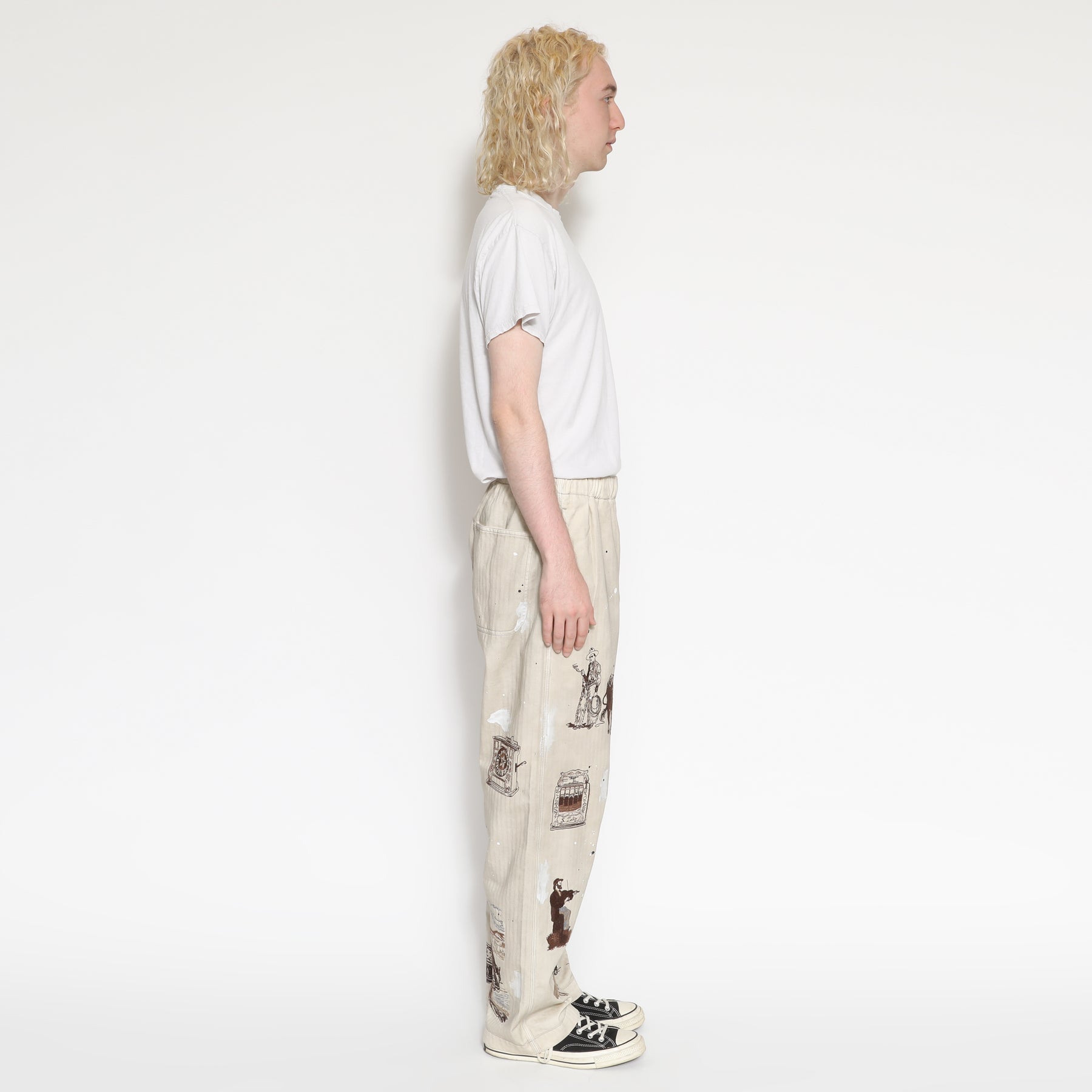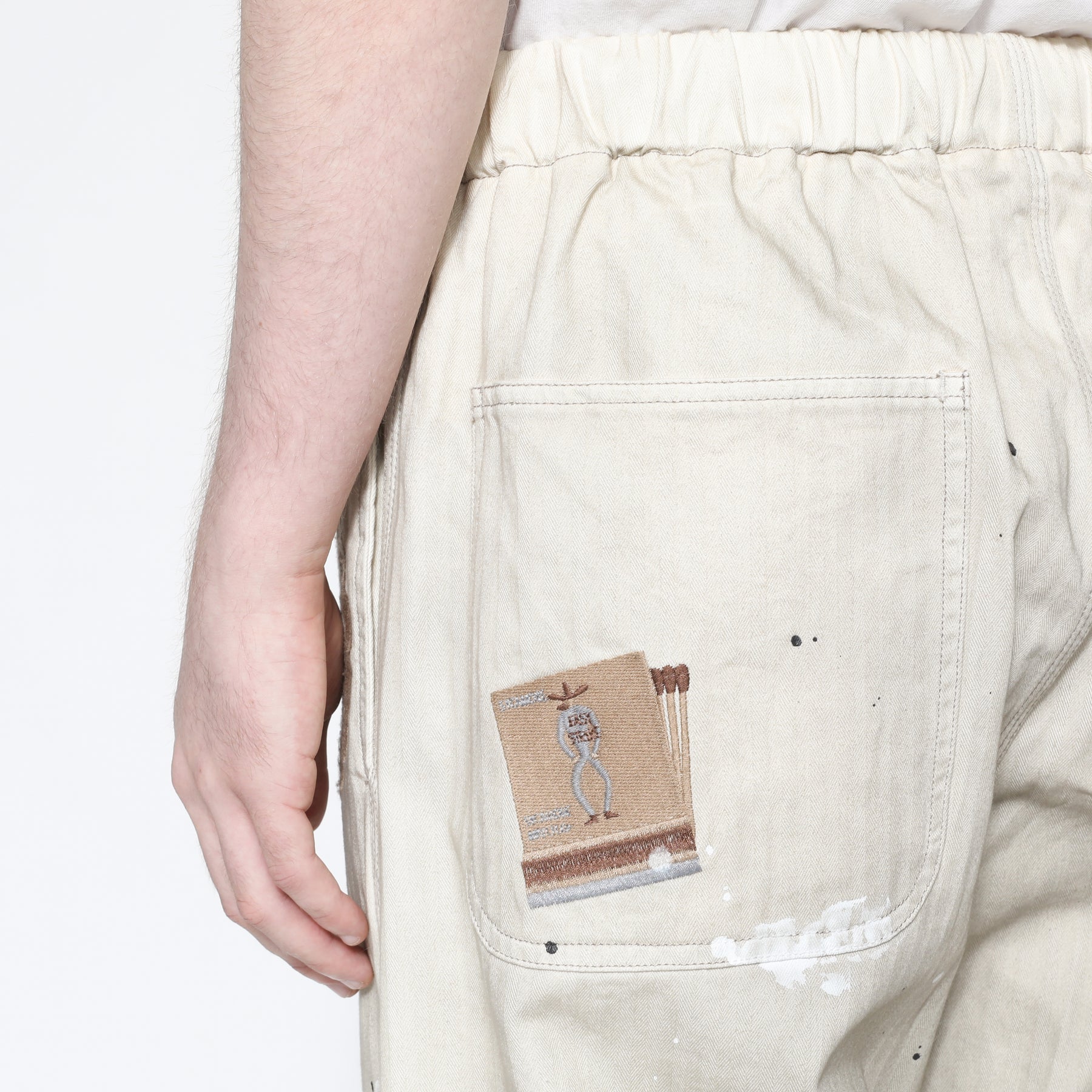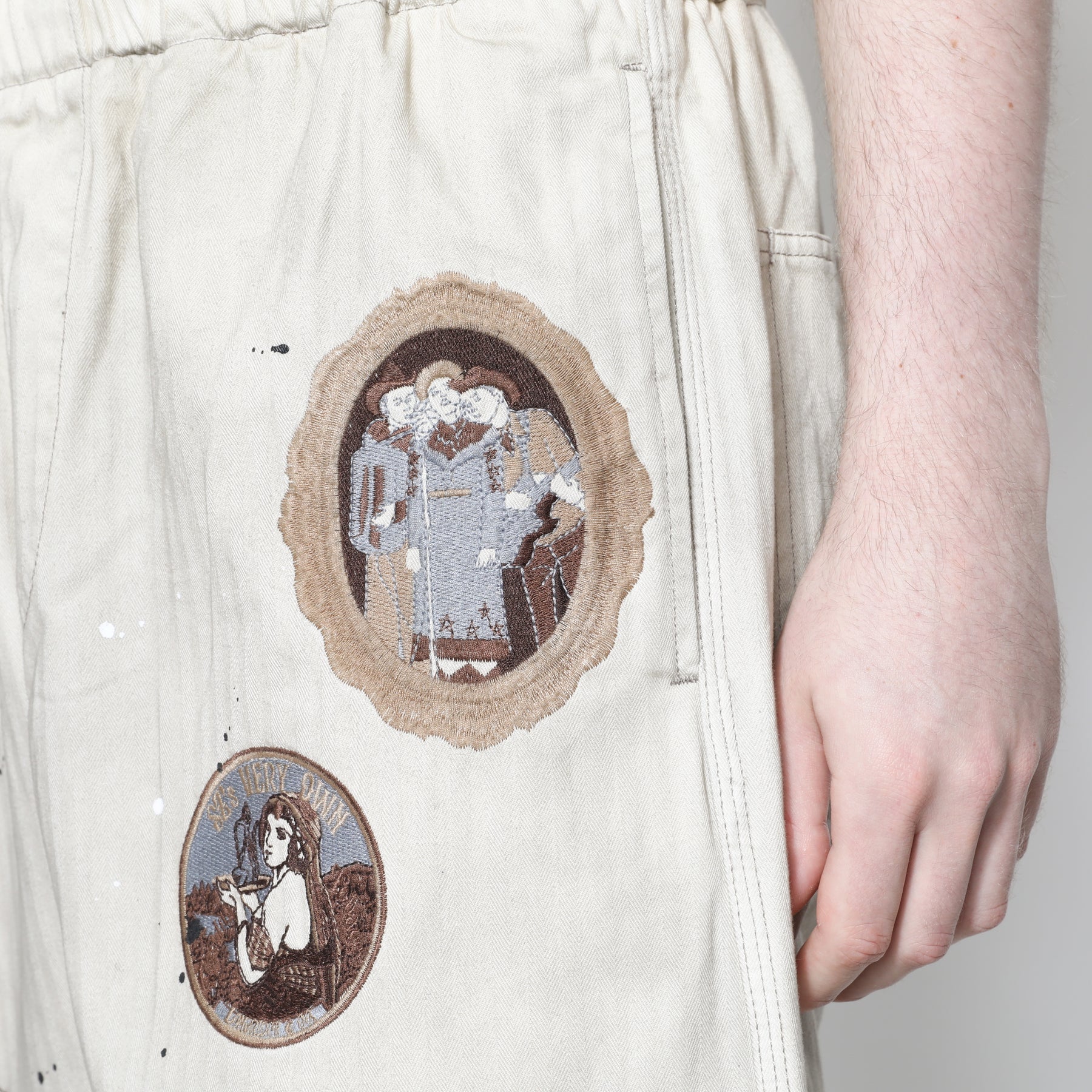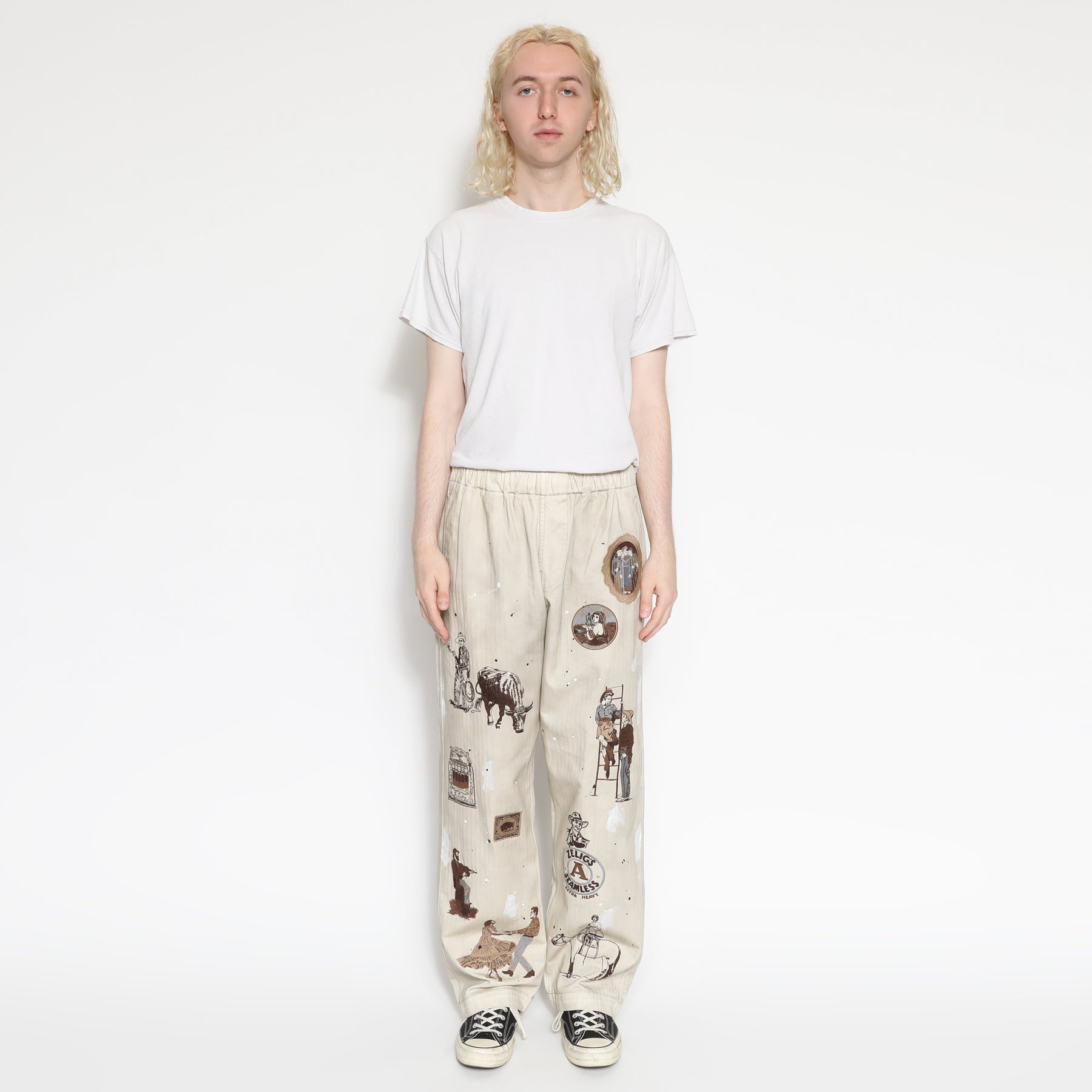 When it comes to western imagery there are so many common subjects that come to mind: cowboys, horses, horseshoes, lassos, etc. Instead of this, we wanted to design a series of pieces that followed themes of travel that happened to be in the west. The final designs feature elements of postcards, unassuming emblems and objects found during travel, and characters and sights someone would see along the way. One focal point of these pieces is a large horizontal scene depicting an outdoor traveler's saloon. This embroidery was developed based on numerous vintage photographs of saloons throughout the west. The herringbone pants and zip jacket from this design group feature a vintage wash with elements of paint stains and discoloration commonly found on vintage coveralls, as well as grey stitching to contrast the natural base color fabric.