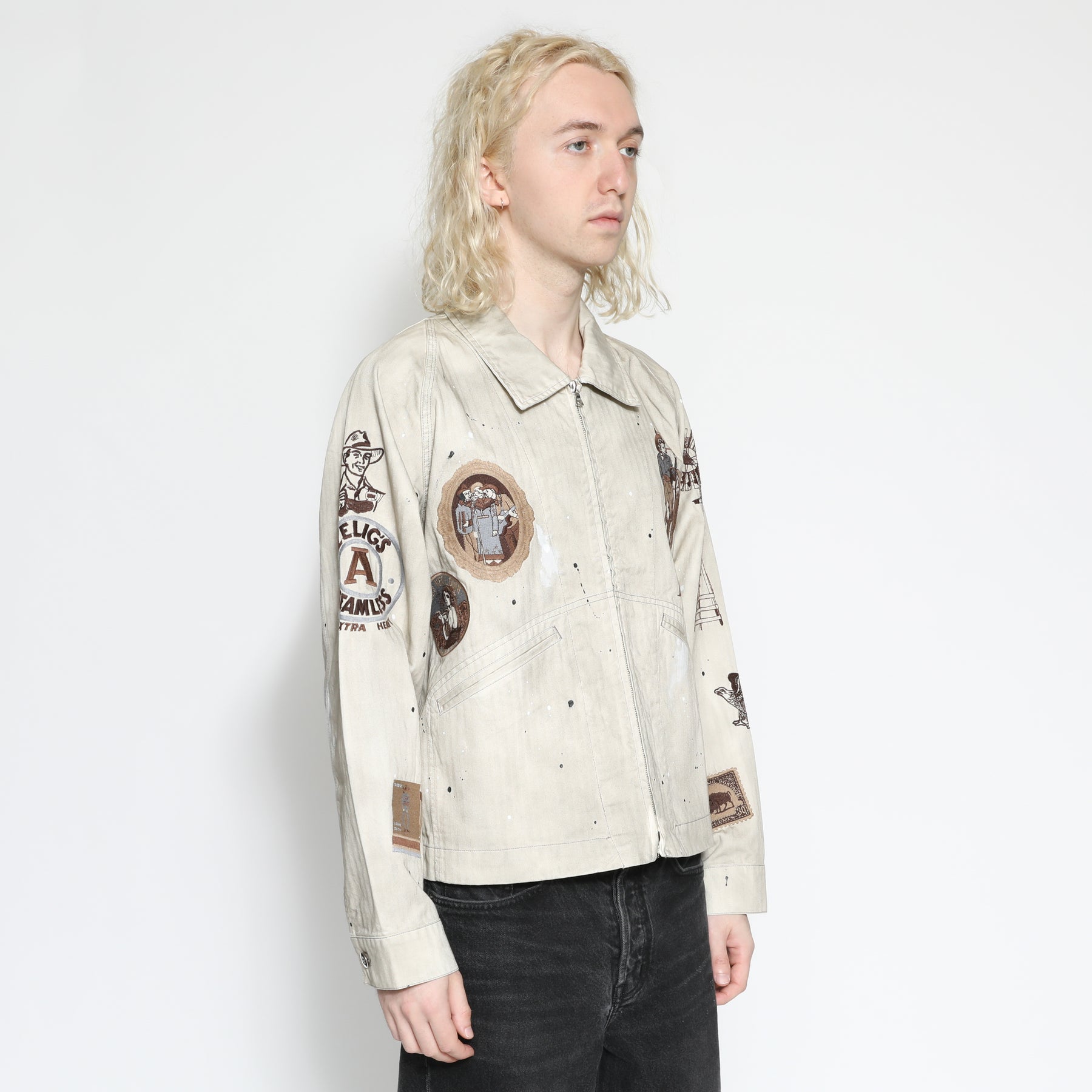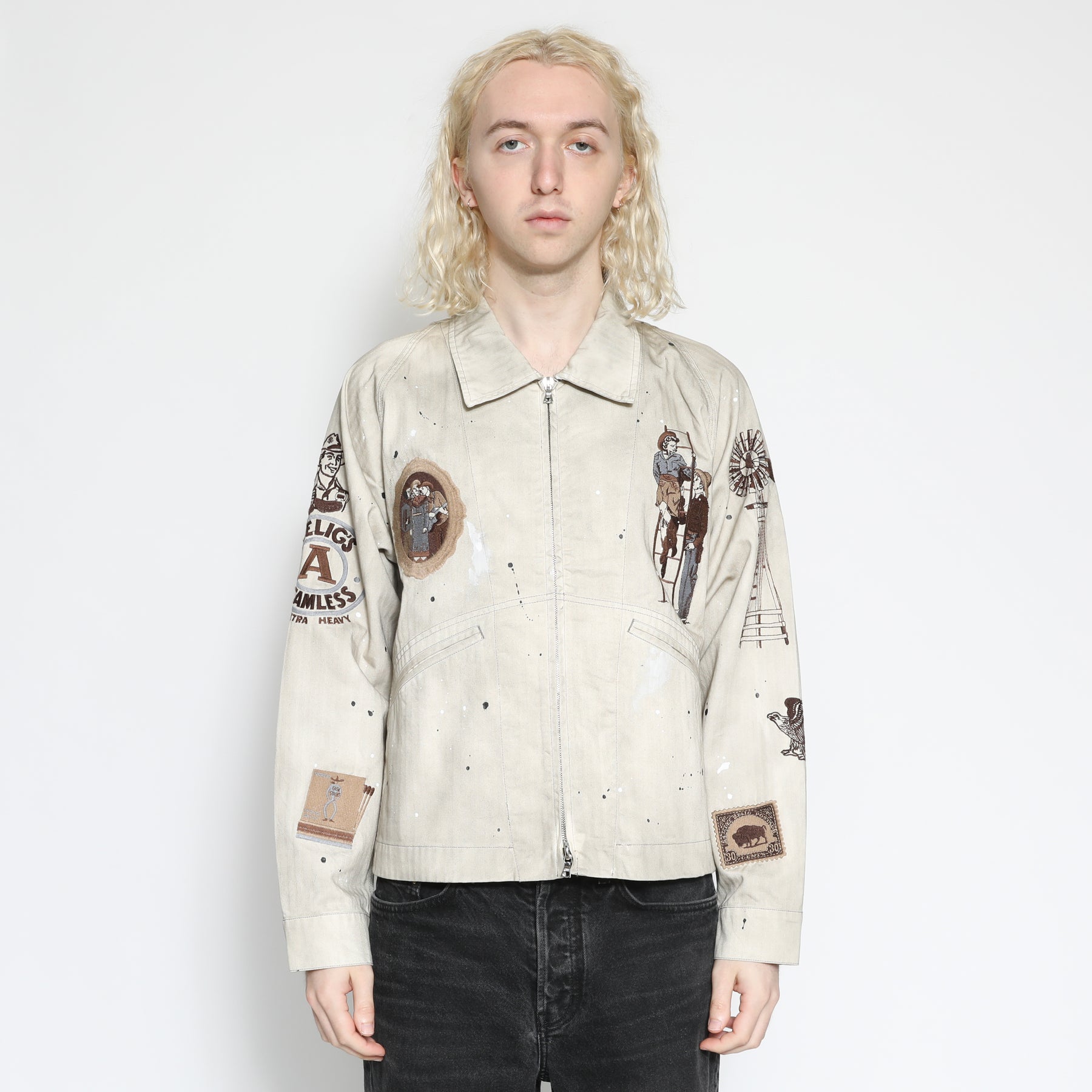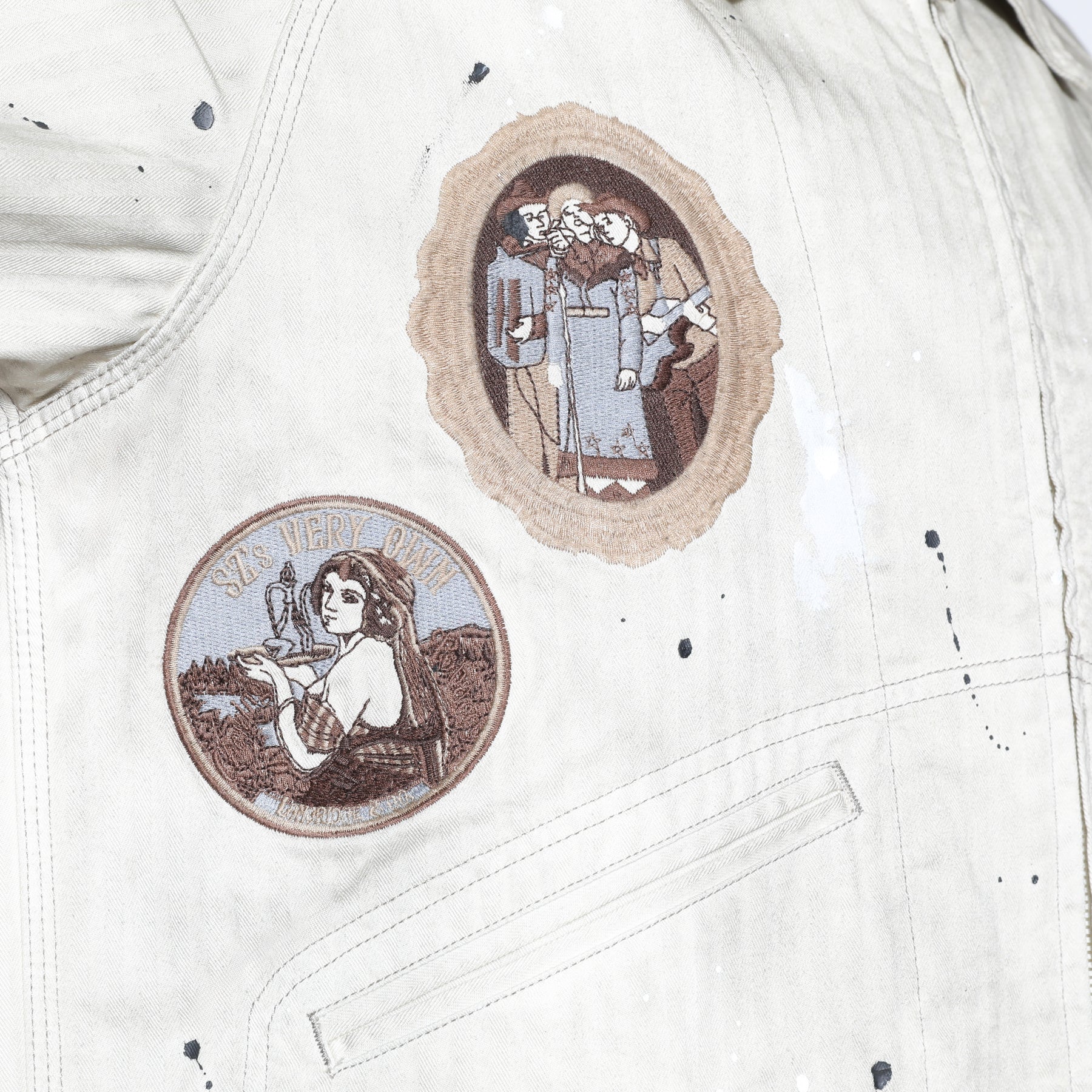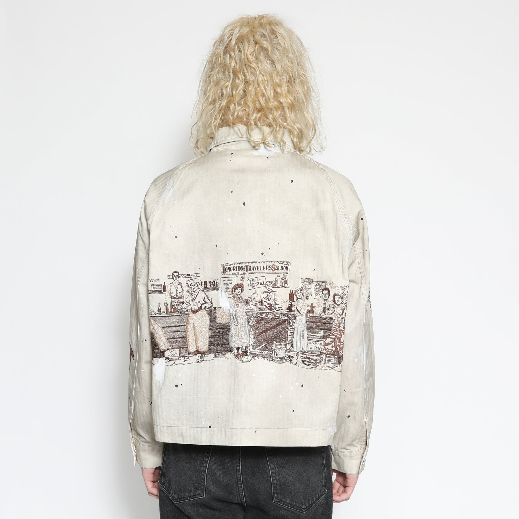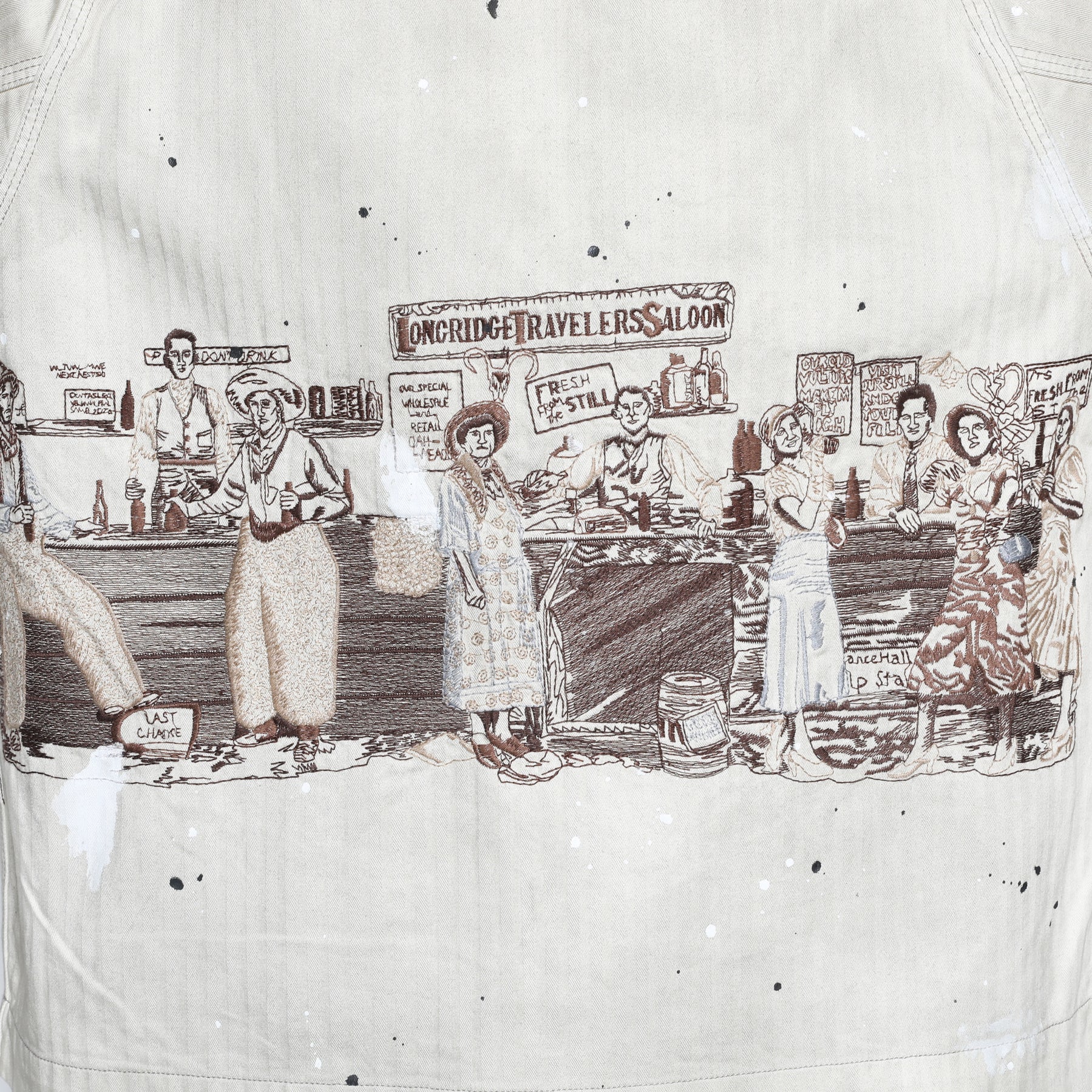 When it comes to western imagery there are so many common subjects that come to mind: cowboys, horses, horseshoes, lassos, etc. Instead of this, we wanted to design a series of pieces that followed themes of travel that happened to be in the west. The final designs feature elements of postcards, unassuming emblems and objects found during travel, and characters and sights someone would see along the way. One focal point of these pieces is a large horizontal scene depicting an outdoor traveler's saloon. This embroidery was developed based on numerous vintage photographs of saloons throughout the west. The herringbone pants and zip jacket from this design group feature a vintage wash with elements of paint stains and discoloration commonly found on vintage coveralls, as well as grey stitching to contrast the natural base color fabric.