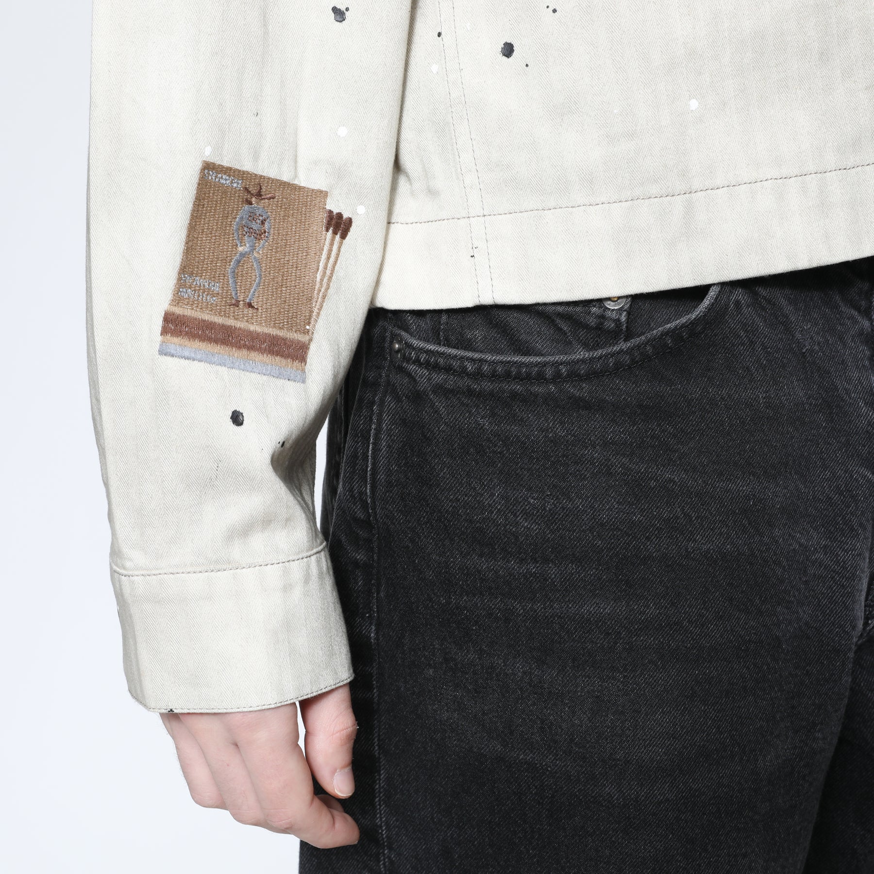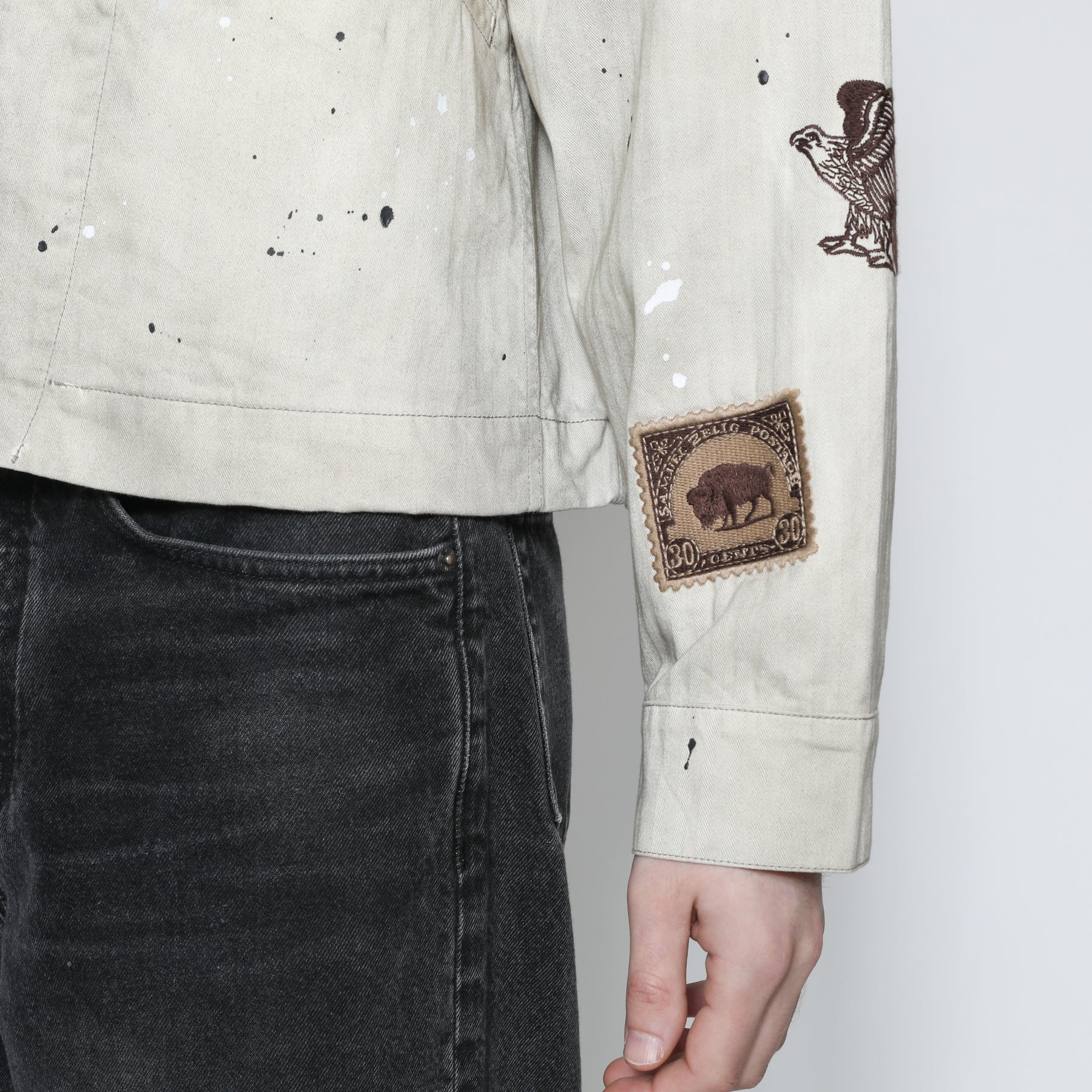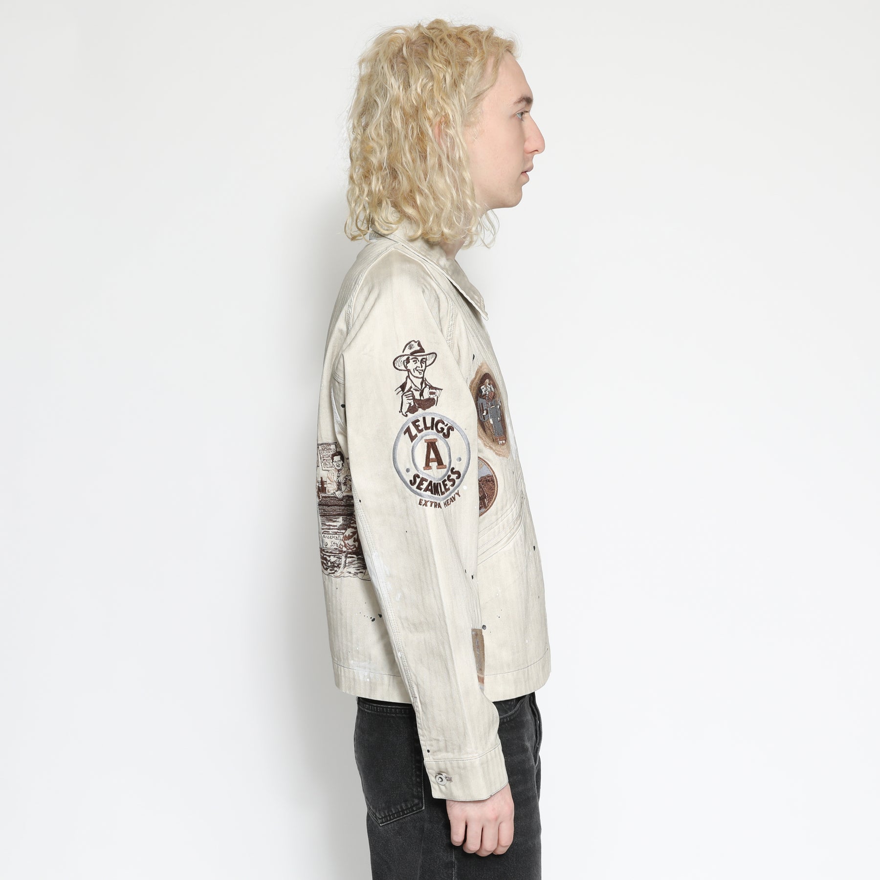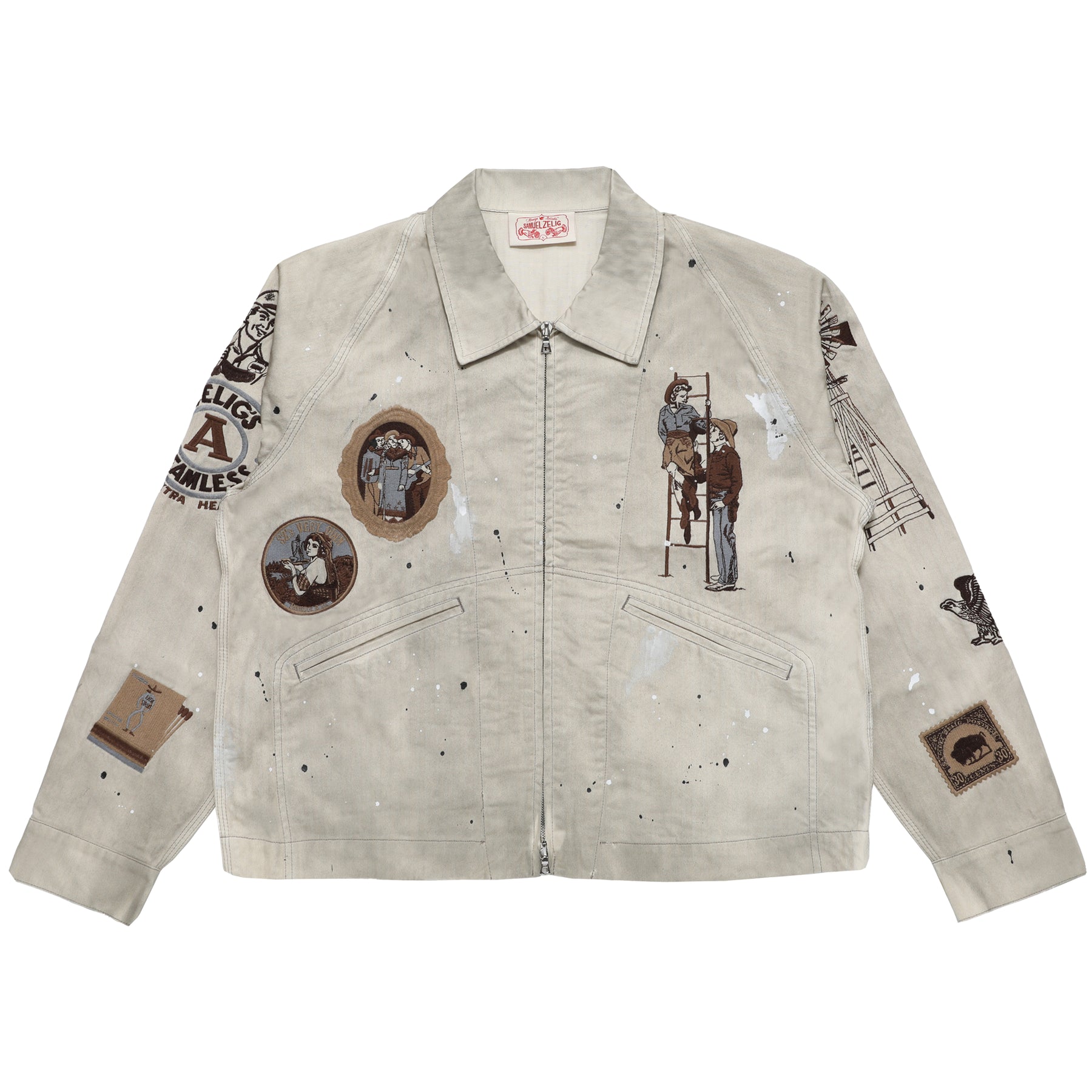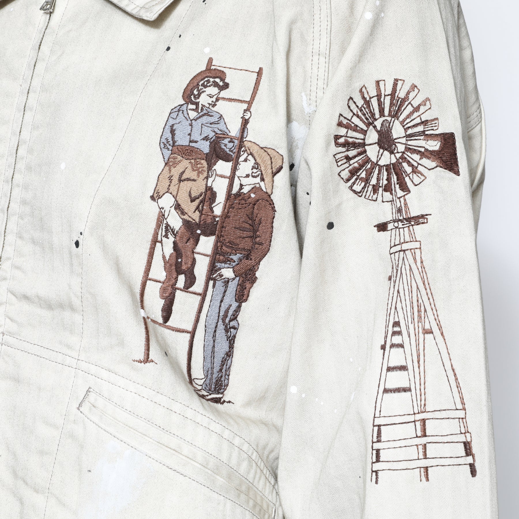 When it comes to western imagery there are so many common subjects that come to mind: cowboys, horses, horseshoes, lassos, etc. Instead of this, we wanted to design a series of pieces that followed themes of travel that happened to be in the west. The final designs feature elements of postcards, unassuming emblems and objects found during travel, and characters and sights someone would see along the way. One focal point of these pieces is a large horizontal scene depicting an outdoor traveler's saloon. This embroidery was developed based on numerous vintage photographs of saloons throughout the west. The herringbone pants and zip jacket from this design group feature a vintage wash with elements of paint stains and discoloration commonly found on vintage coveralls, as well as grey stitching to contrast the natural base color fabric.