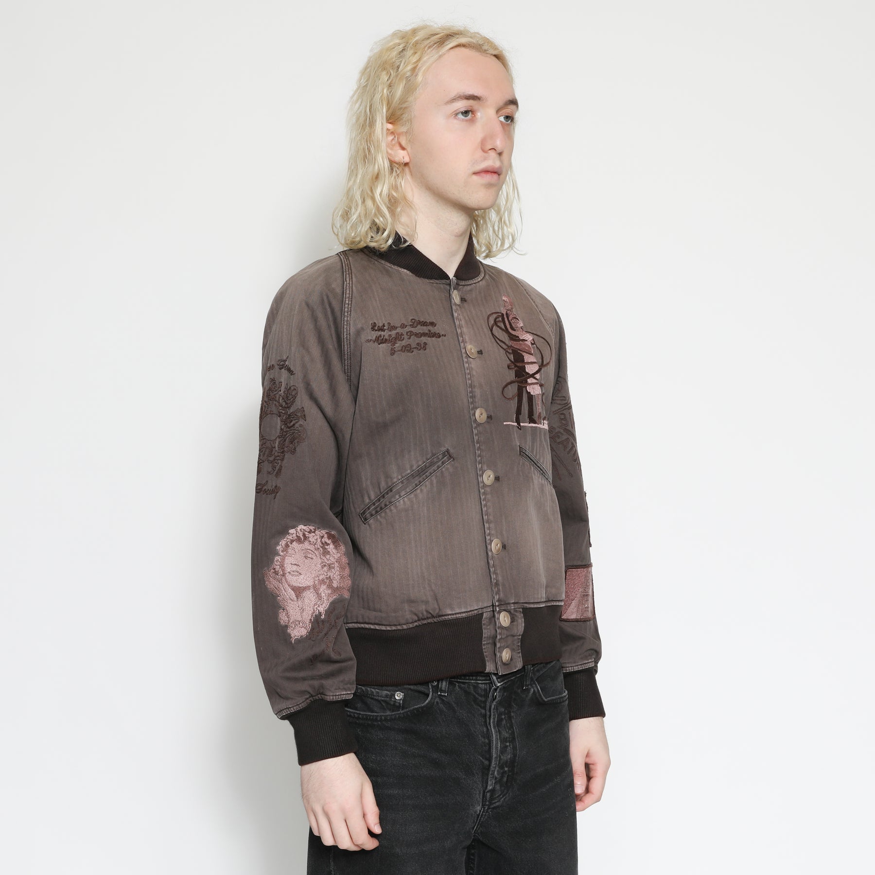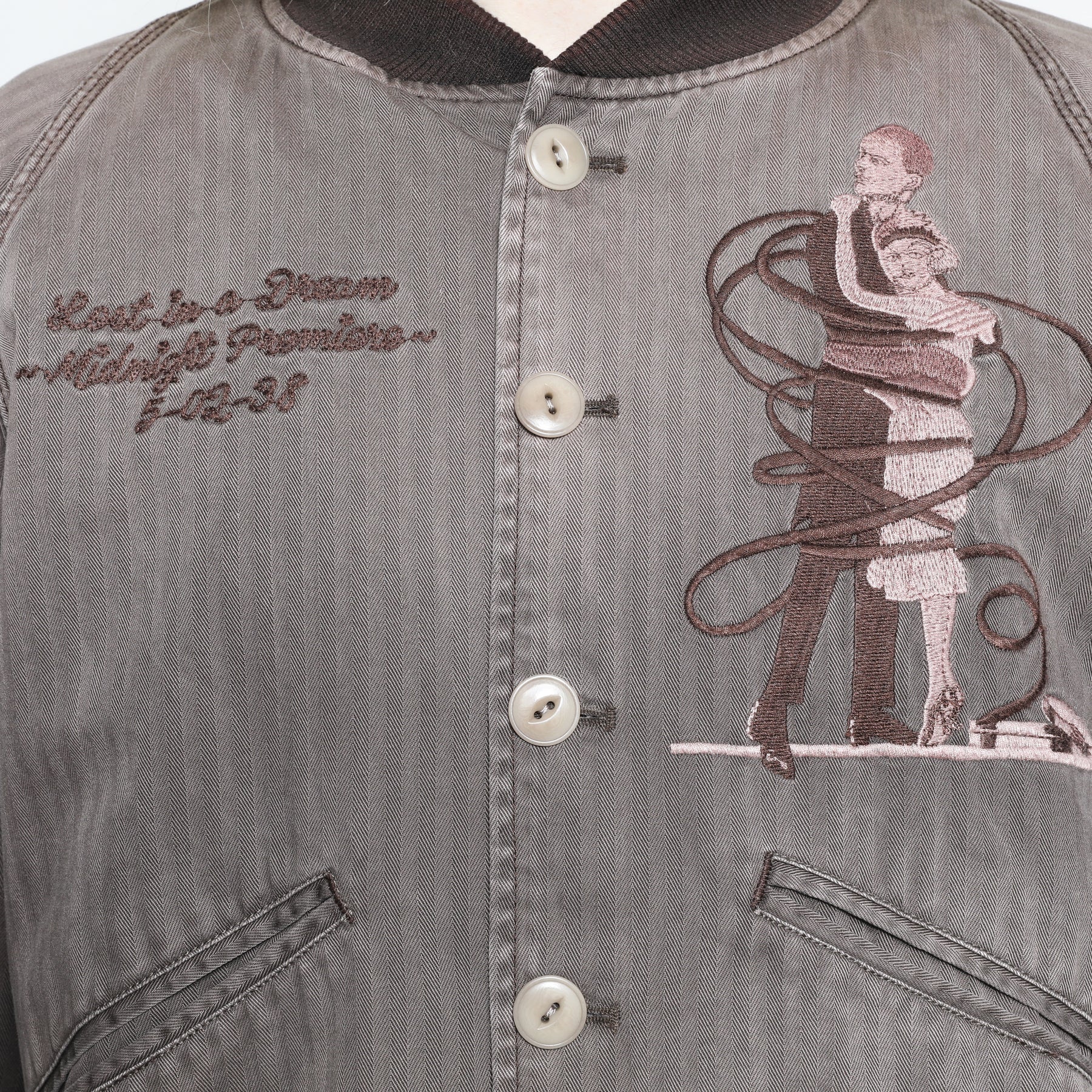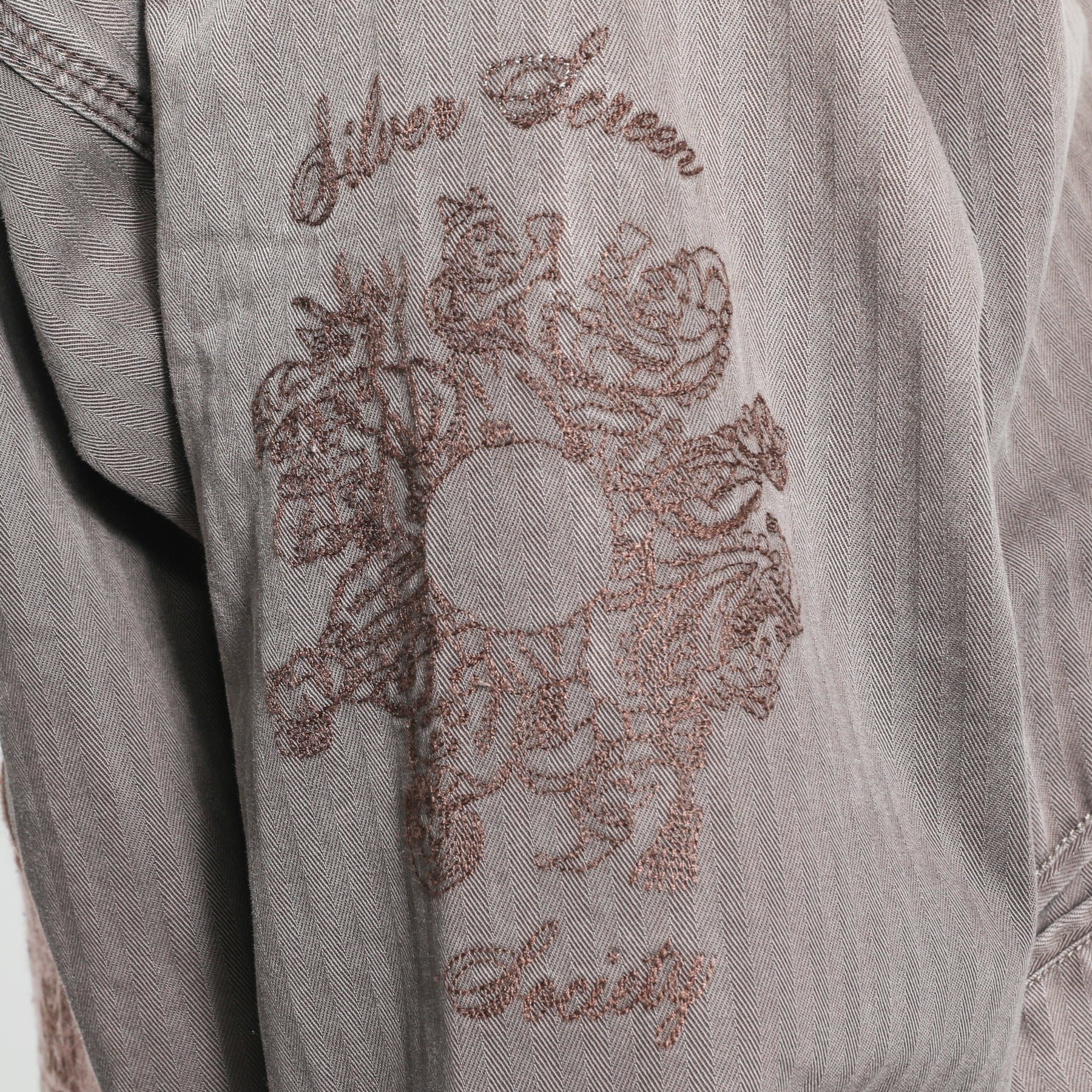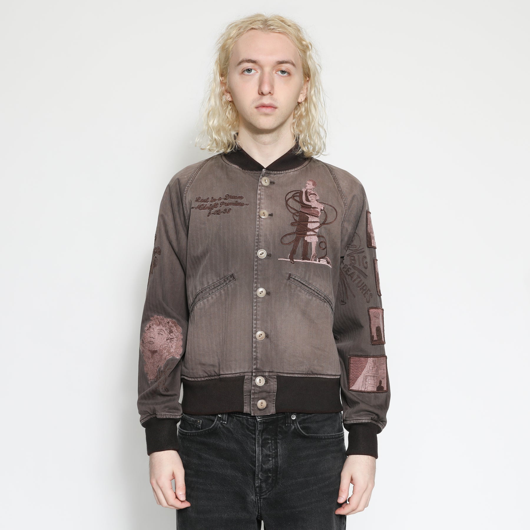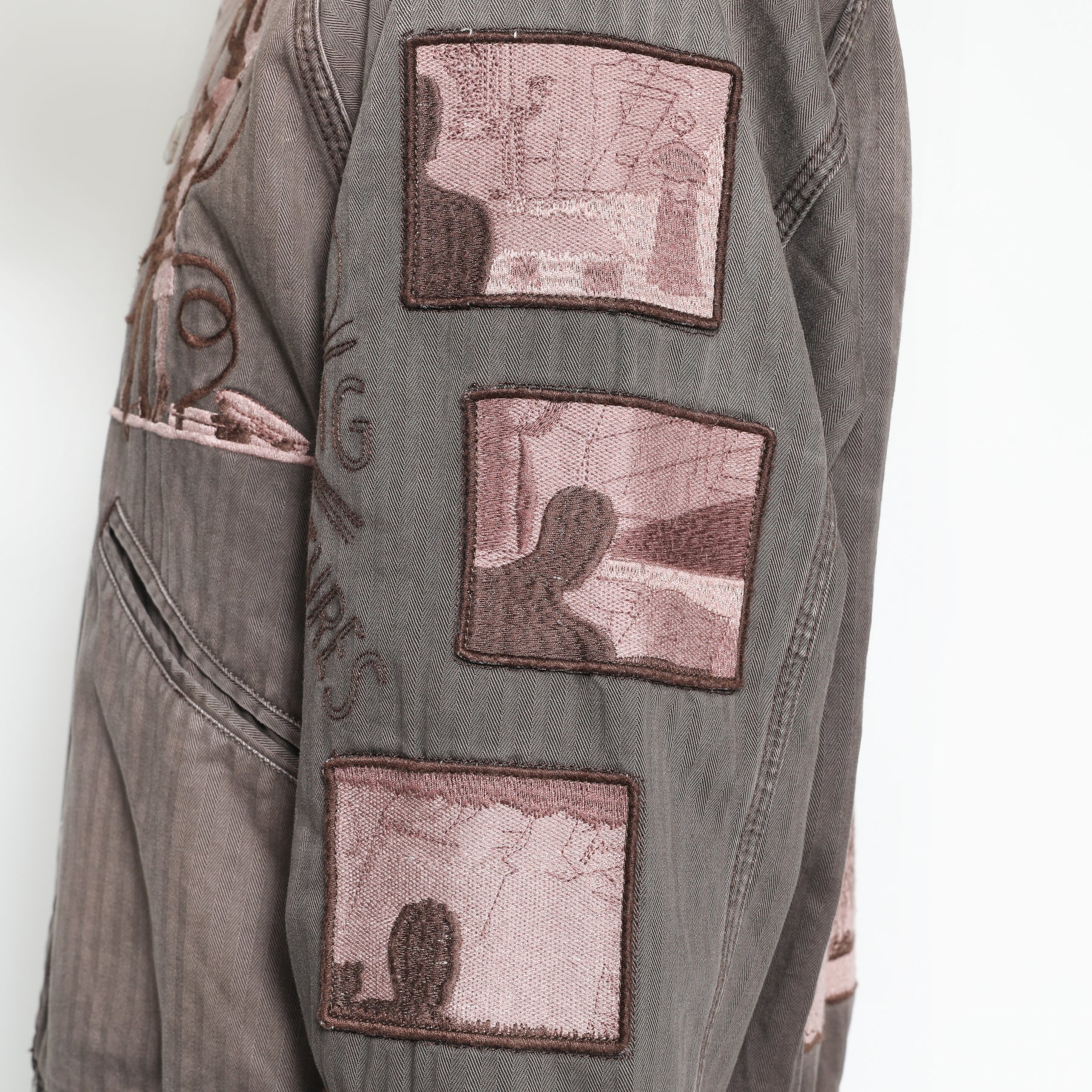 Film plays a large role in our designs, but for this group we wanted to make it a prominent theme. The designs for this group are centered around our film club the ‘Silver Screen Society’. Each piece features embroideries of fictional movie posters, storyboard patches, and other illustrations to commemorate the shared experience of watching a film. The color scheme of these embroideries are kept tonal to give the effect of colorless film while still exhibiting shades other than black and white. One set of styles from the group features a tonal olive color scheme, while the other features a tonal mauve color scheme.