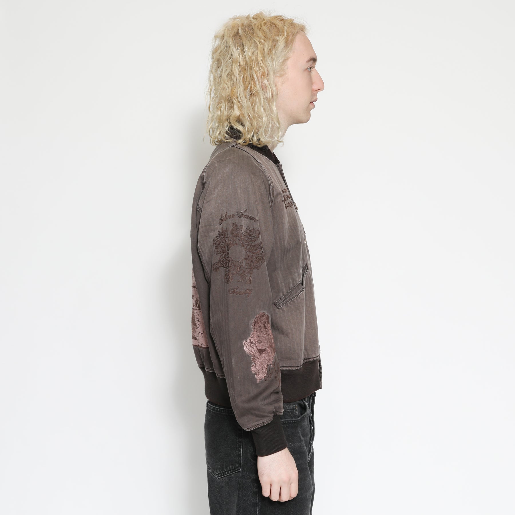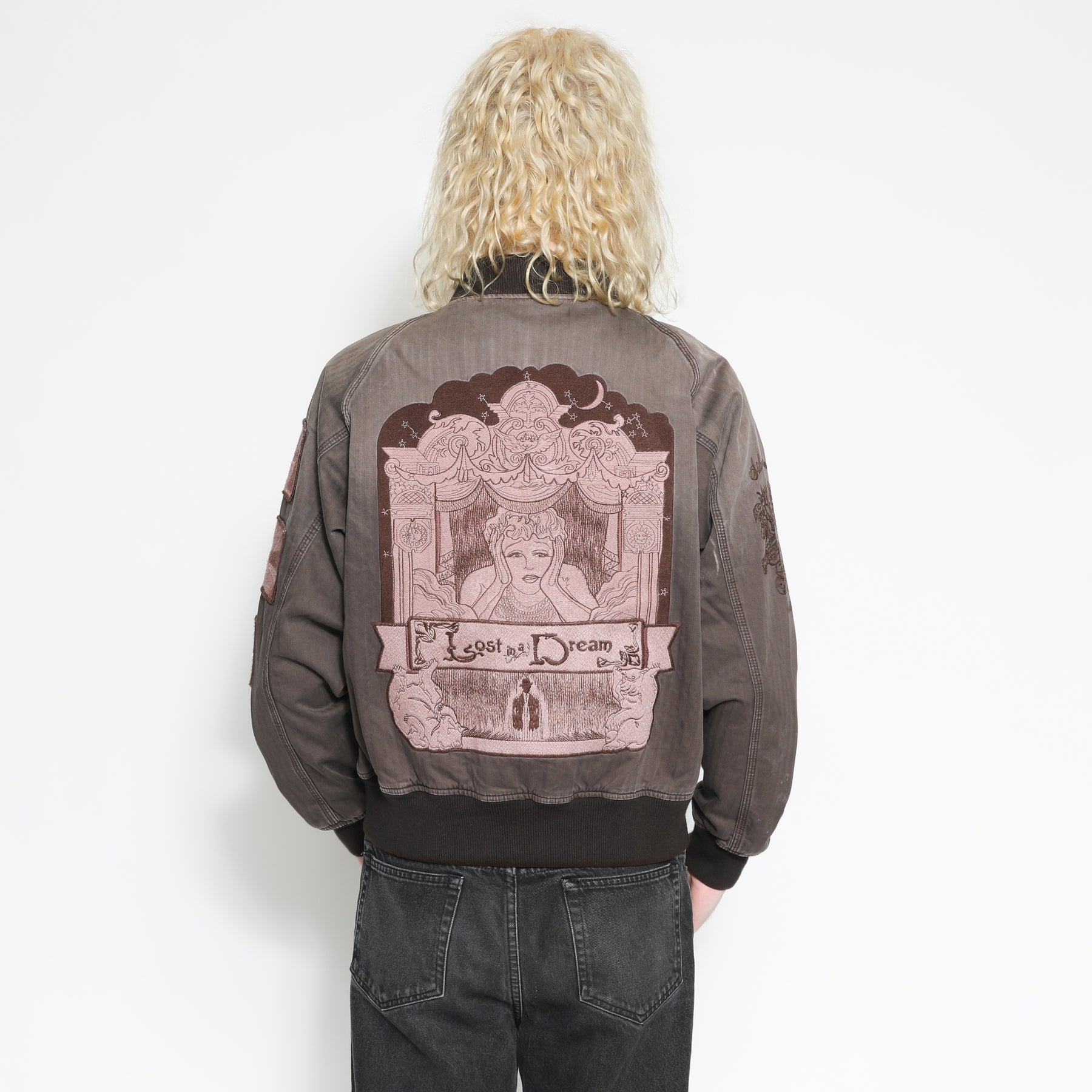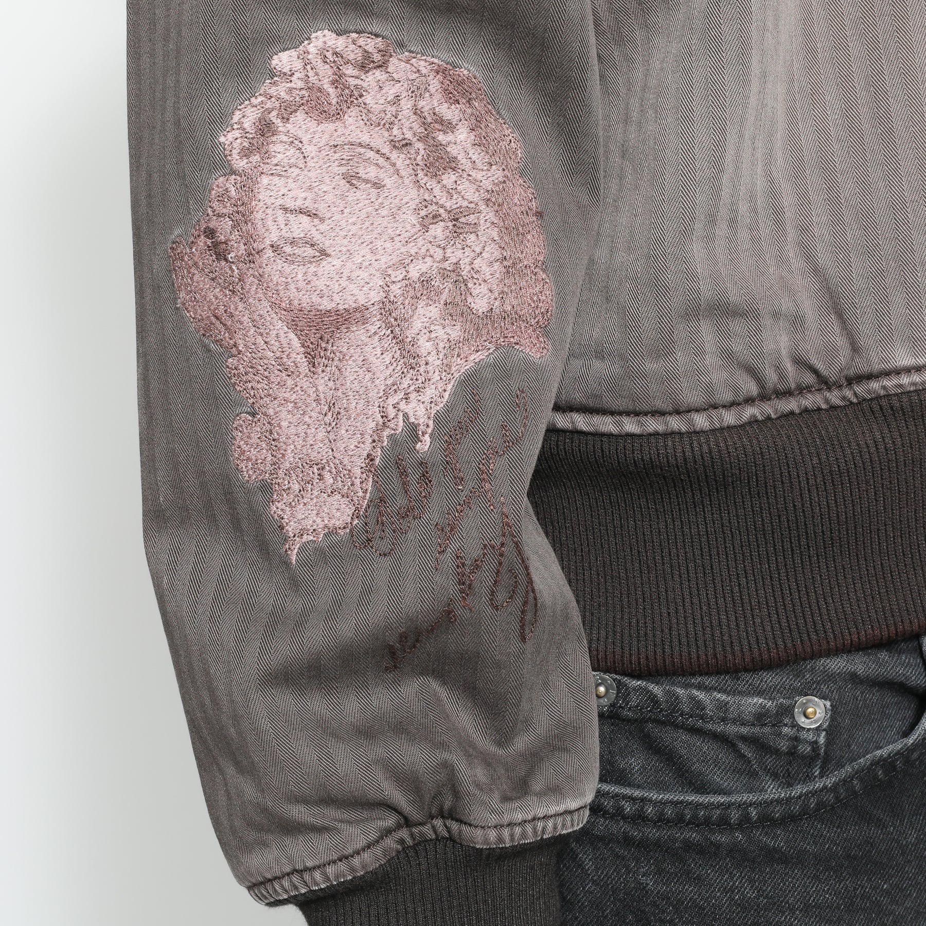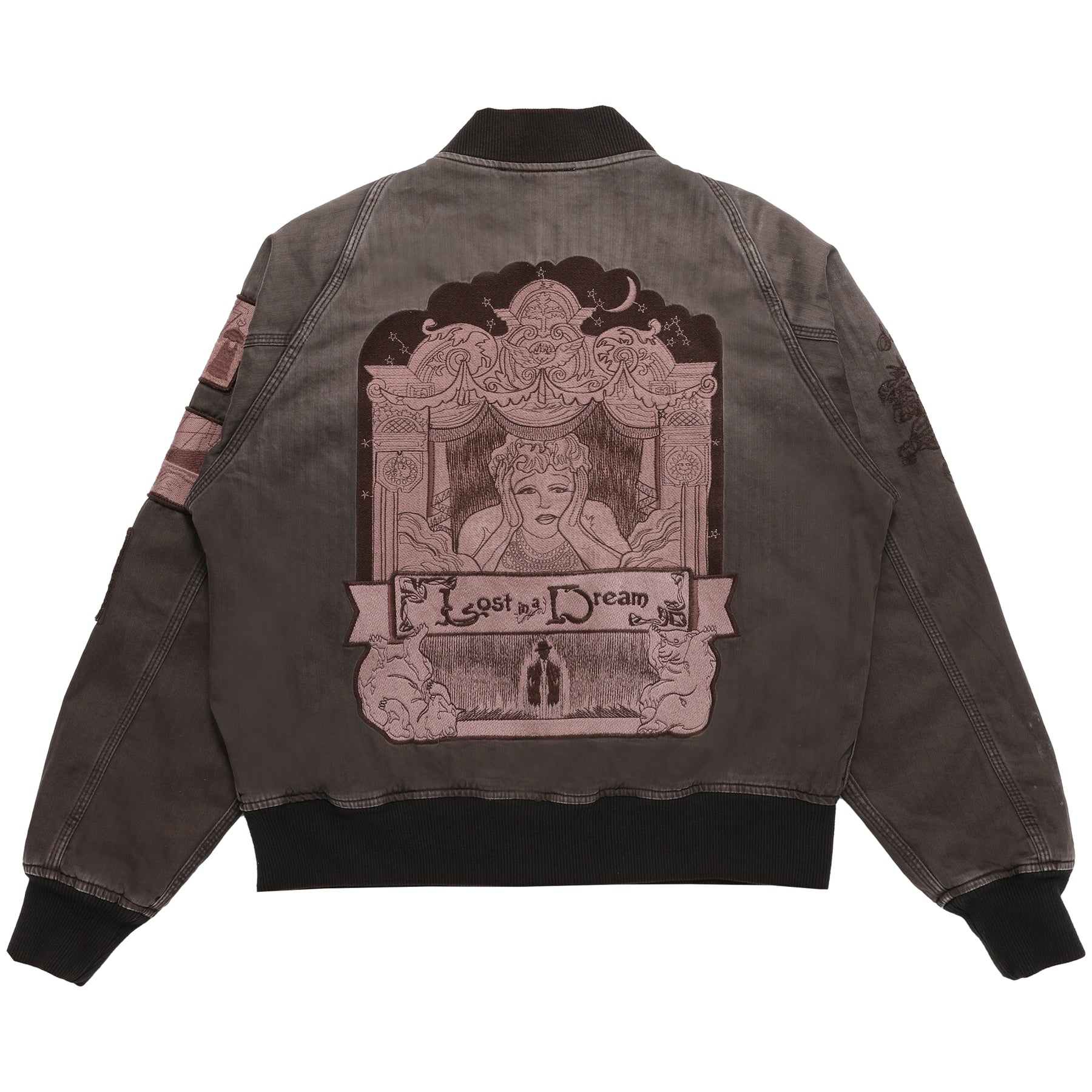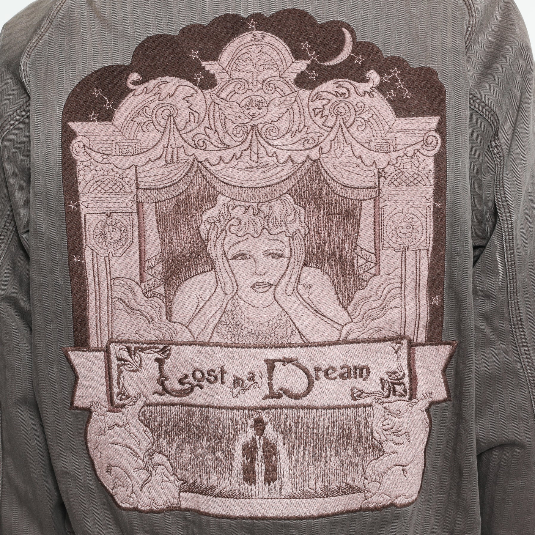 Film plays a large role in our designs, but for this group we wanted to make it a prominent theme. The designs for this group are centered around our film club the ‘Silver Screen Society’. Each piece features embroideries of fictional movie posters, storyboard patches, and other illustrations to commemorate the shared experience of watching a film. The color scheme of these embroideries are kept tonal to give the effect of colorless film while still exhibiting shades other than black and white. One set of styles from the group features a tonal olive color scheme, while the other features a tonal mauve color scheme.